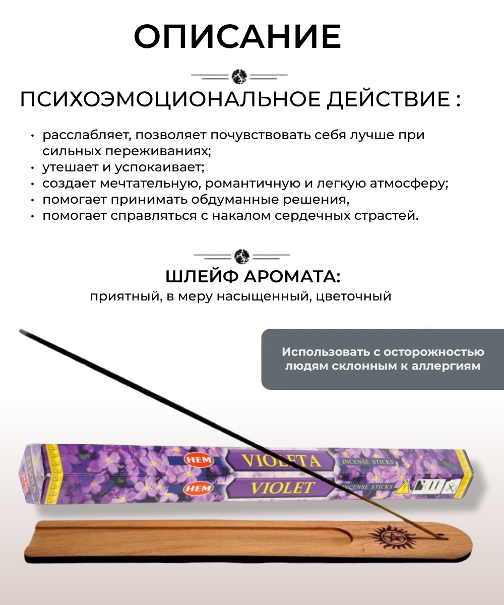 | Дополнительная информация | Воскуривание благовоний – настоящее искусство. Соблюдение всех нюансов позволит не только насладиться приятным ароматом, но и извлечь из этого пользу: - установите ароматическую палочку на специальную подставку (это аксессуар, защищающий мебель от пепла и произвольного возгорания, благодаря чему вы сможете спокойно насладиться сеансом ароматерапии); - зажгите изделие (убедитесь, что появилось небольшое пламя); - затем, после 5-10 секунд потушите его и оставьте тлеть (кончик благовония должен быть красного цвета); - чтобы полностью погасить ароматическую палочку, нужно тлеющим концом воткнуть ее в песок или землю в цветочном горшке. |