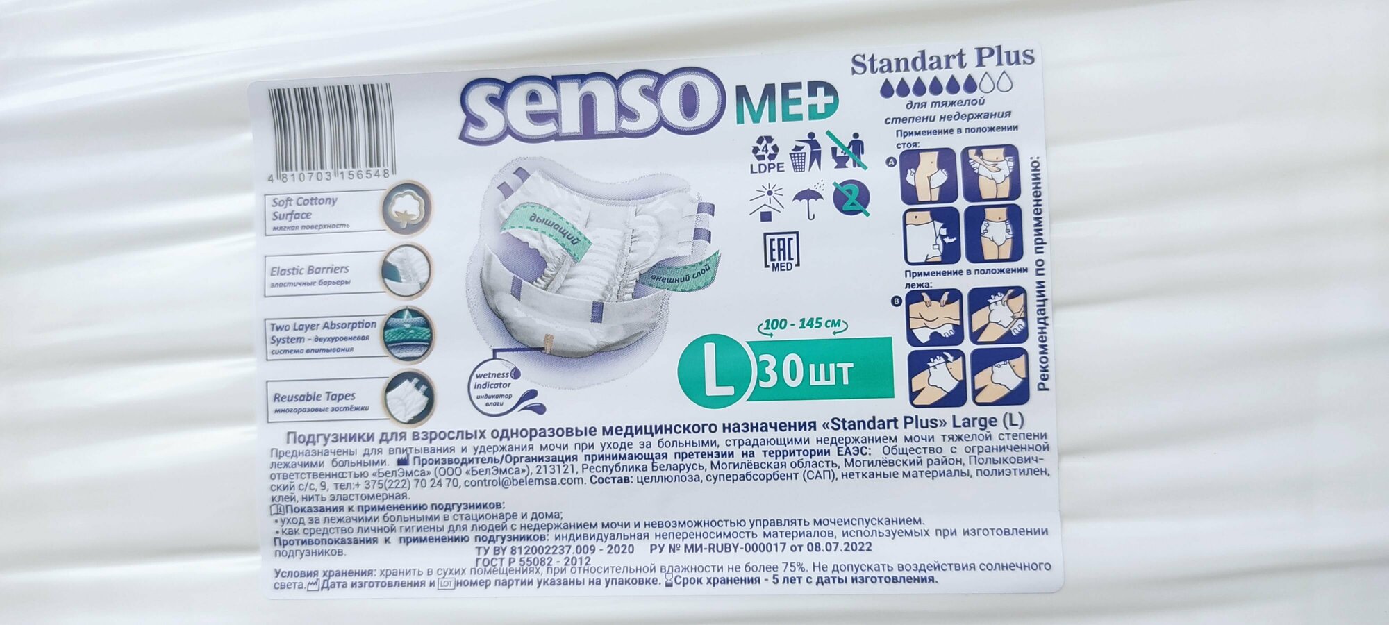 Подгузники для взрослых Senso Med, размер L, 30 штук, 6 капель (100-145 см обхват талии)