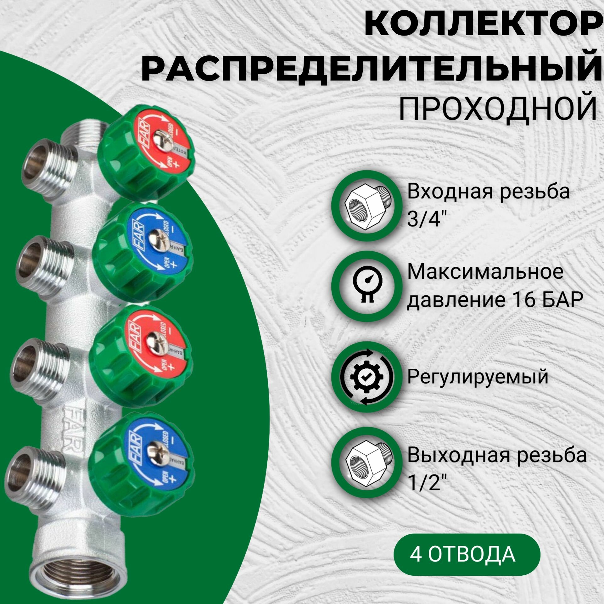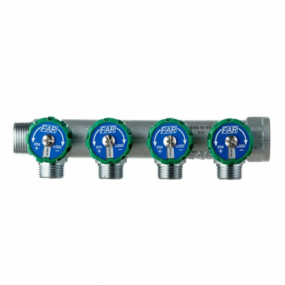 Купить Коллектор FAR 3/4"х1/2" 4 выхода под плоскую прокладку хромированный с вентилями