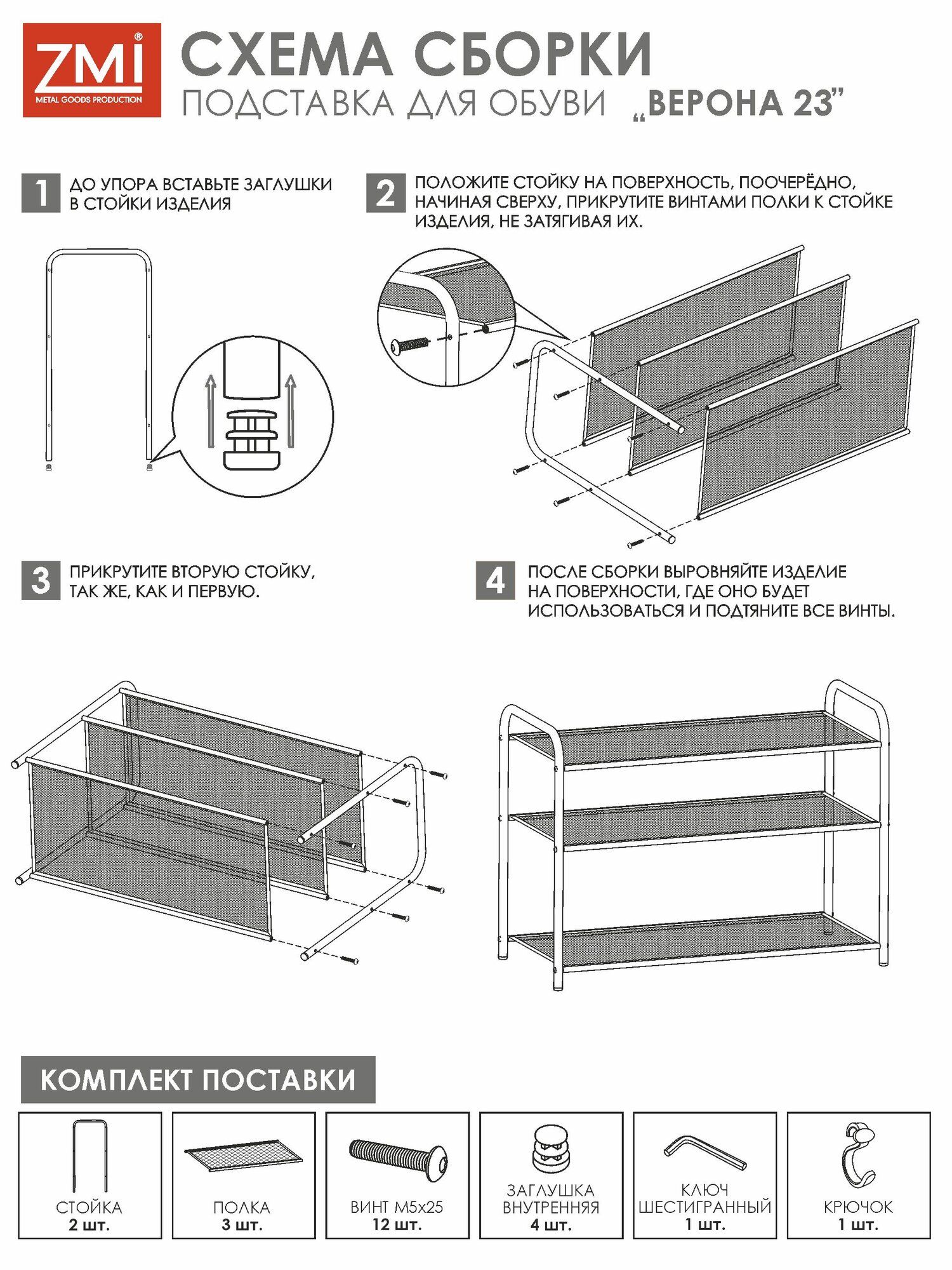 | Комплектация | Полка для обуви "Женева-23", 645х270х600 мм, 3 полки, металл, чёрная, ПДО Ж23 Ч |