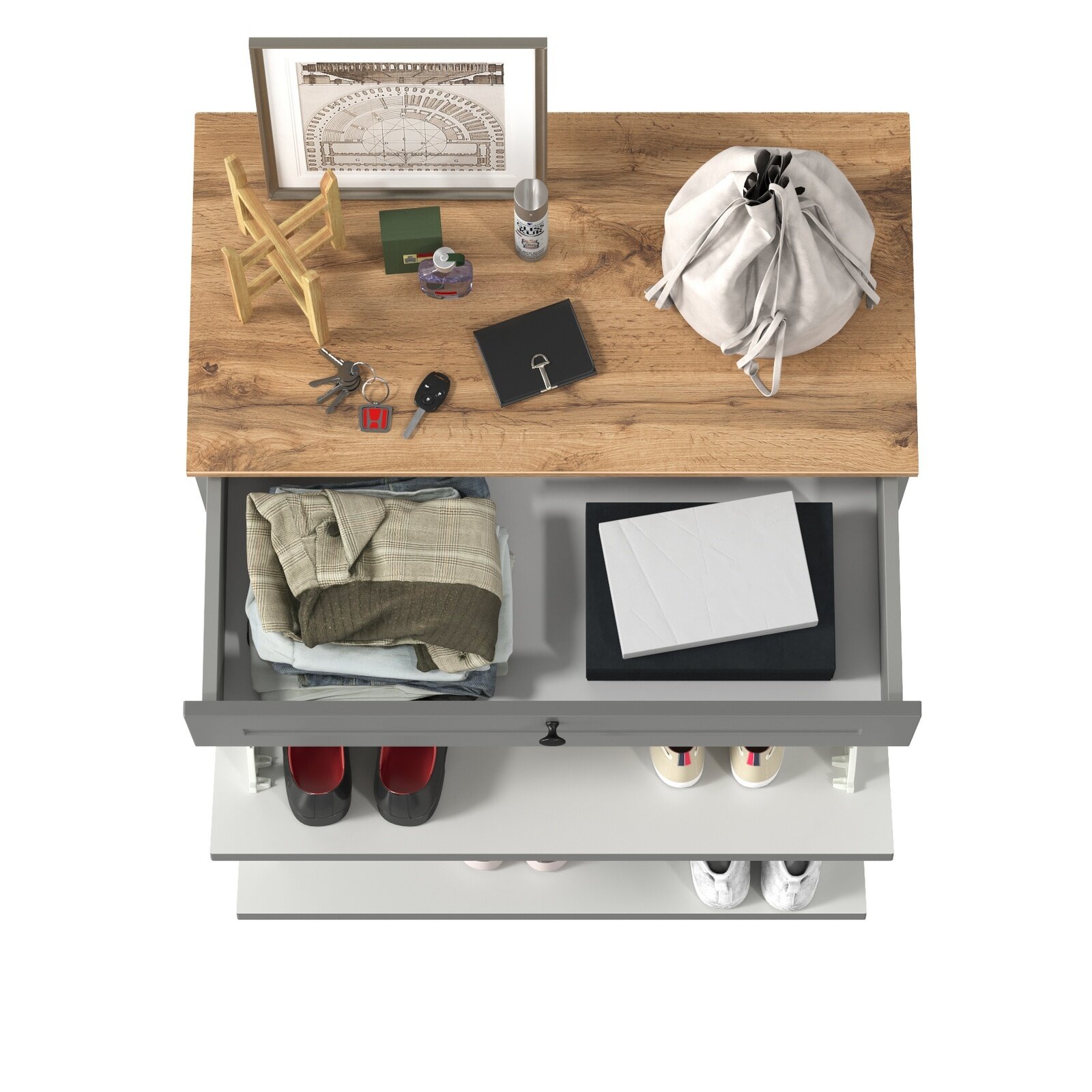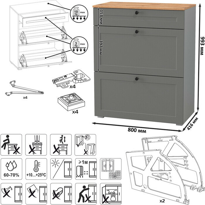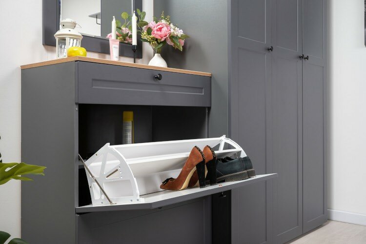 | Комплектация | с выдвижным ящиком для мелочей сверху и двумя откидными дверками с полками для обуви снизу; каждая откидная дверь расчитана для хранения и размещения 6 пар невысокой обуви; скрытые направляющие выдвижных ящиков; двери оснащены четырехшарнирными петлями без доводчиков; регулируемые опоры; лицевая фурнитура в виде черных аккуратных ручек на фасадах |