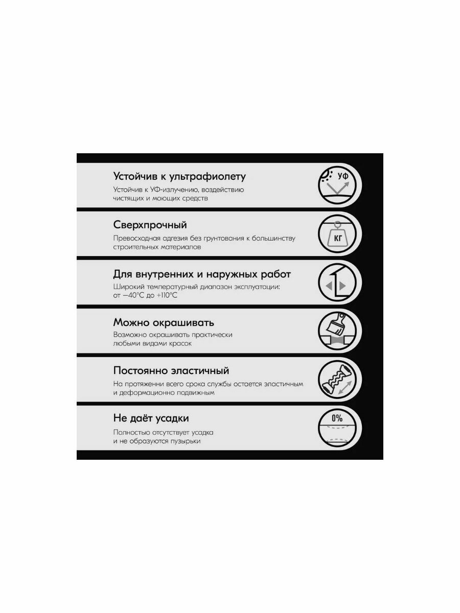 | Особенности | влагостойкость / возможность окрашивания / высокотемпературный / морозостойкий / термостойкий / устойчивый к УФ-излучению / эластичность |