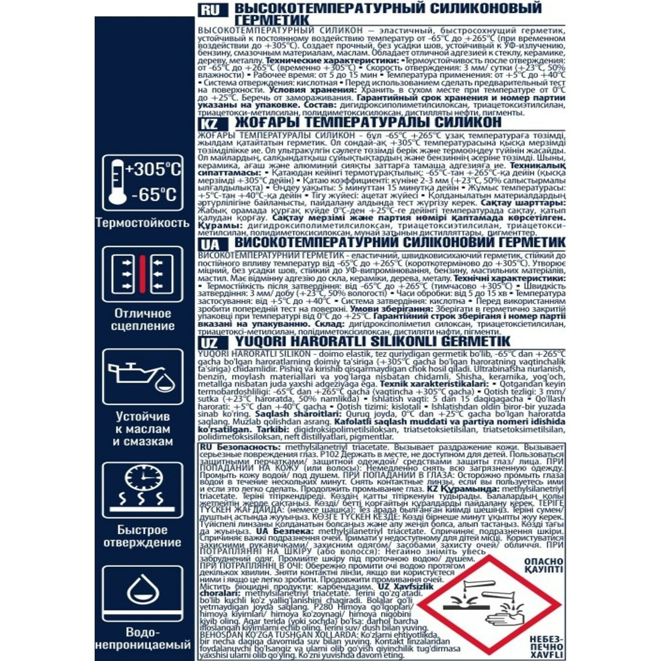 | Особенности | влагостойкость / высокотемпературный / морозостойкий / огнестойкий / термостойкий / устойчивый к УФ-излучению / эластичность |