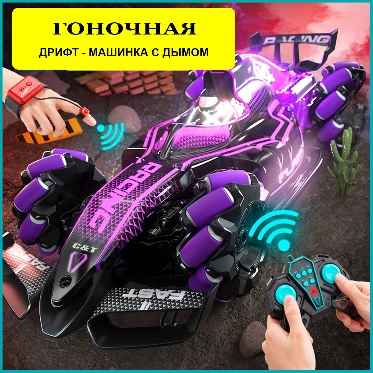 Машинка на пульте управления. С подсветкой "дыма". Детская гоночная машина на радиоуправлении. Управление жестами одной рукой. Spray Car Цвет: фиолетовый