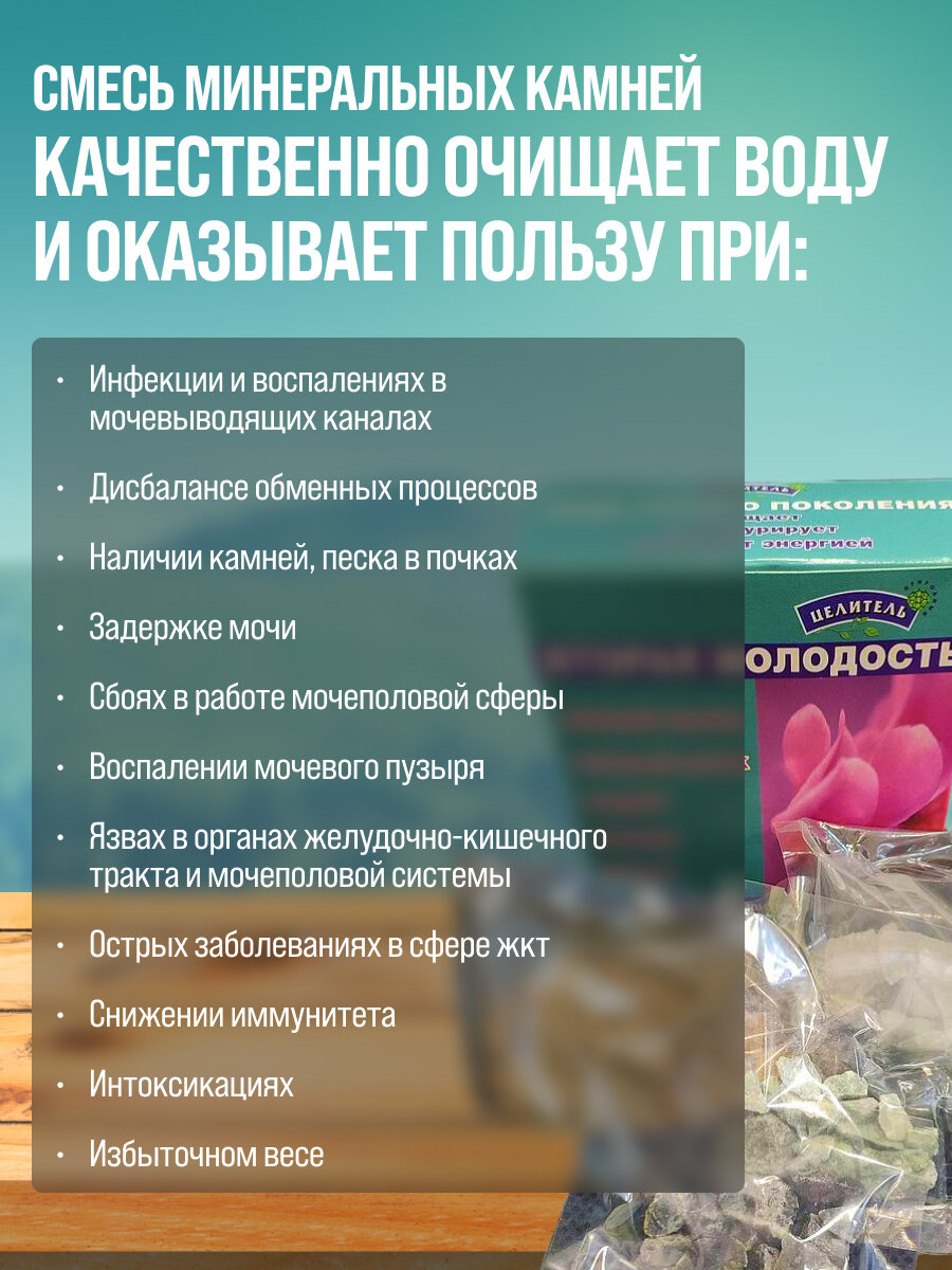 Минерализатор воды Вторая молодость 380 гр., Сила 5 минералов: Кремень, Розовый песок, Жадеит, Кварц, Шунгит, Природный целитель, натуральные камни для очистки воды интересное: