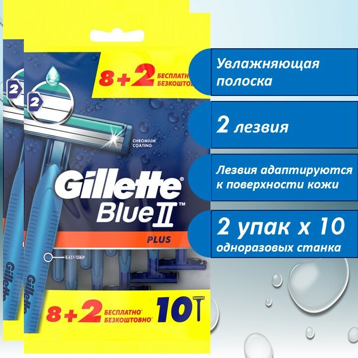 Одноразовый бритвенный станок Gillette Blue2 Plus, с 2 лезвиями, 10, фиксированная головка, синий, 10 шт.