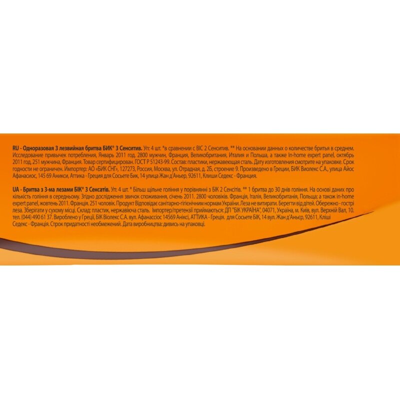 | Комплектация | Бритвы одноразовые, BIC "3 Sensitive", 3-лезв.,увл.полоса, для чувств.кожи уп. 4 шт |