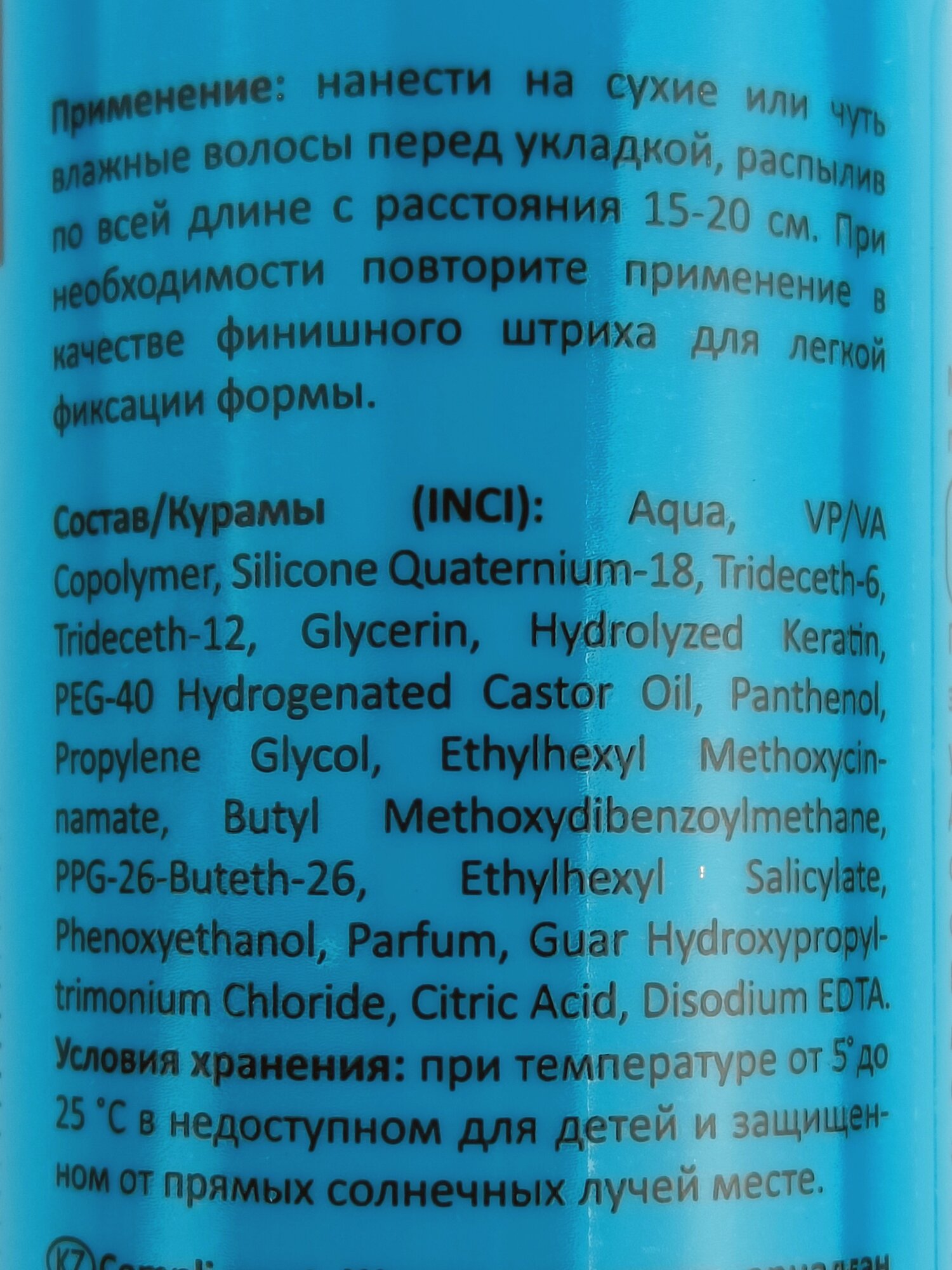 | Способ применения | нанести на сухие или чуть влажные волосы перед укладкой, распылив по всей длине с расстояния 15-20 см. При необходимости повторите применение в качестве финиша для легкой фиксации формы |