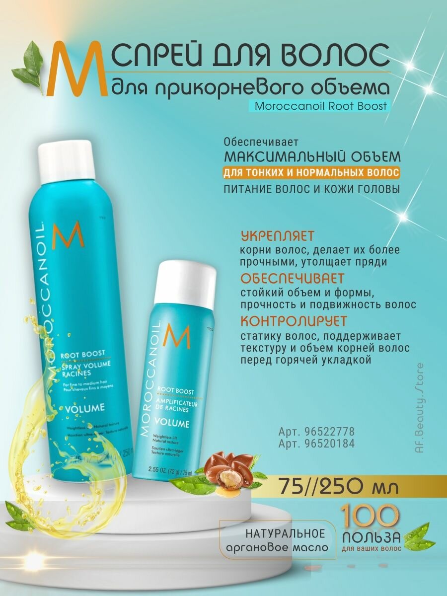 | Способ применения | хорошо встряхните и распылите достаточное количество спрея Moroccanoil® Root Boost на корни подсушенных полотенцем волос. Используя круглую расческу, высушите волосы попрядно, приподнимая от корней |