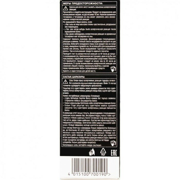 | Дополнительная информация | краски для волос могу вызывать серьезные аллергические реакции. Проведите тест на аллергическую реакцию. Продукт не предназначен для лиц младше 16 лет. Содержит перекись водорода. Избегать попадания в глаза |