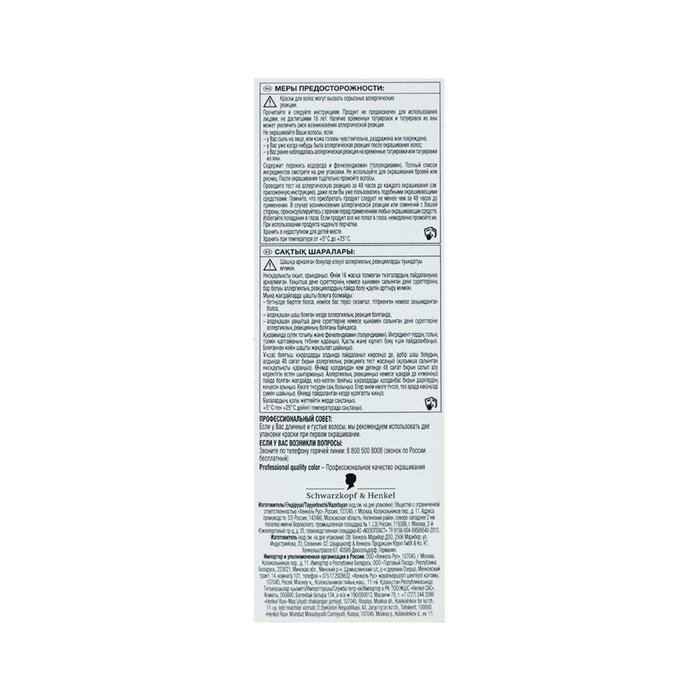 | Дополнительная информация | содержит перекись водорода. Избегать попадания в глаза. Краски для волос могу вызывать серьезные аллергические реакции. Проведите тест на аллергическую реакцию. Продукт не предназначен для лиц младше 16 лет |