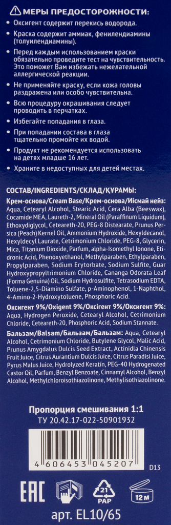 | Дополнительная информация | тест на чувствительности: приготовьте смесь из небольшого количества крем-основы и такого же объёма оксигента, перемешав их в любой неметаллической посуде. Не следует готовить весь объем краски. Нанесите приготовленную смесь на небольшой участок кожи на внутренней стороне локтевого сгиба или за ухом и оставьте на 10-15 минут. Затем смойте. Если в течение суток признаки аллергической реакции не появились, можете использовать краску |