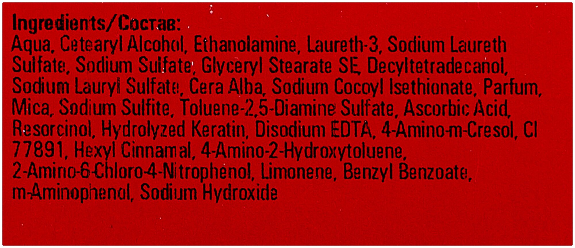 | Состав | aqua, cetearyl alcohol, ethanolamine, laureth-3, sodium laureth sulfate, glyceryl stearate se, toluene-2,5 diamine sulfate, sodium sulfate, decyltetradecanol, sodium lauryl sulfate, cera alba, parfum, sodium cocoyl isethionate, mica, hydroxyethyl-3,4-methylenedioxyaniline hci,resorcinol, sodium sulfate, m-aminophenol, ascorbic acid, hydrolyzed keratin, disidium edta, 2-methylresorcinol, ci 77891, hexyl cinnamal, limonene, benzyl benzoate, citric acid |
