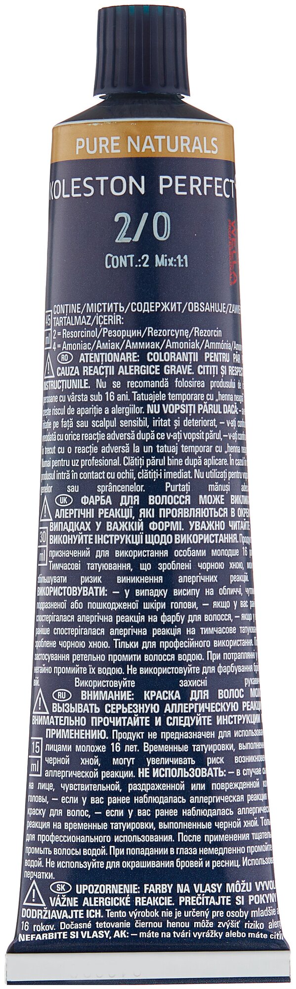 | Способ применения | приготовление смеси: смешайте краску с окислителем Welloxon Perfect в пропорции 1:1. окрашивание всех волос: намочите волосы; Распределите краску на волосах и равномерно прочешите. Время выдержки с теплом 15 минут; без тепла 20 минут. окрашивание отросших корней: нанесите красящую смесь только на прикорневую часть; с теплом на 15 минут, без тепла 20 минут. осветление: нанести красящую смесь только по длине волос и концы; с теплом 10 минут, без тепла 20 минут. Или нанести на прикорневую часть; с теплом 15-25 минут, без тепла 30-40 минут. По истечении времени тщательно смойте остатки краски водой, применяя шампунь Wella для окрашенных волос |