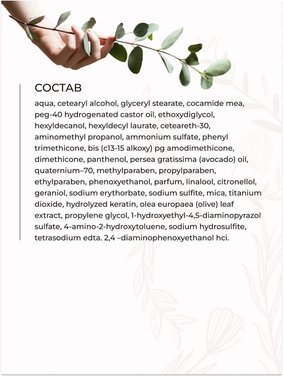 | Состав | aqua, cetearyl alcohol, glyceryl stearate, cocamide mea, peg-40 hydrogenated castor oil, ethoxydiglycol, hexyldecanol, hexyldecyl laurate, ceteareth-30, aminomethyl propanol, ammonium sulfate, phenyl trimethicone, bis (c13-15 alkoxy) pg amodimethicone, dimethicone, panthenol, persea gratissima (avocado) oil, quaternium–70, methylparaben, propylparaben, ethylparaben, phenoxyethanol, parfum, linalool, citronellol, geraniol, sodium erythorbate, sodium sulfite, mica, titanium dioxide, hydrolyzed keratin, olea europaea (olive) leaf extract, propylene glycol, 1-hydroxyethyl-4,5-diaminopyrazol sulfate, 4-amino-2-hydroxytoluene, sodium hydrosulfite, tetrasodium edta. 2,4 –diaminophenoxyethanol hci. |