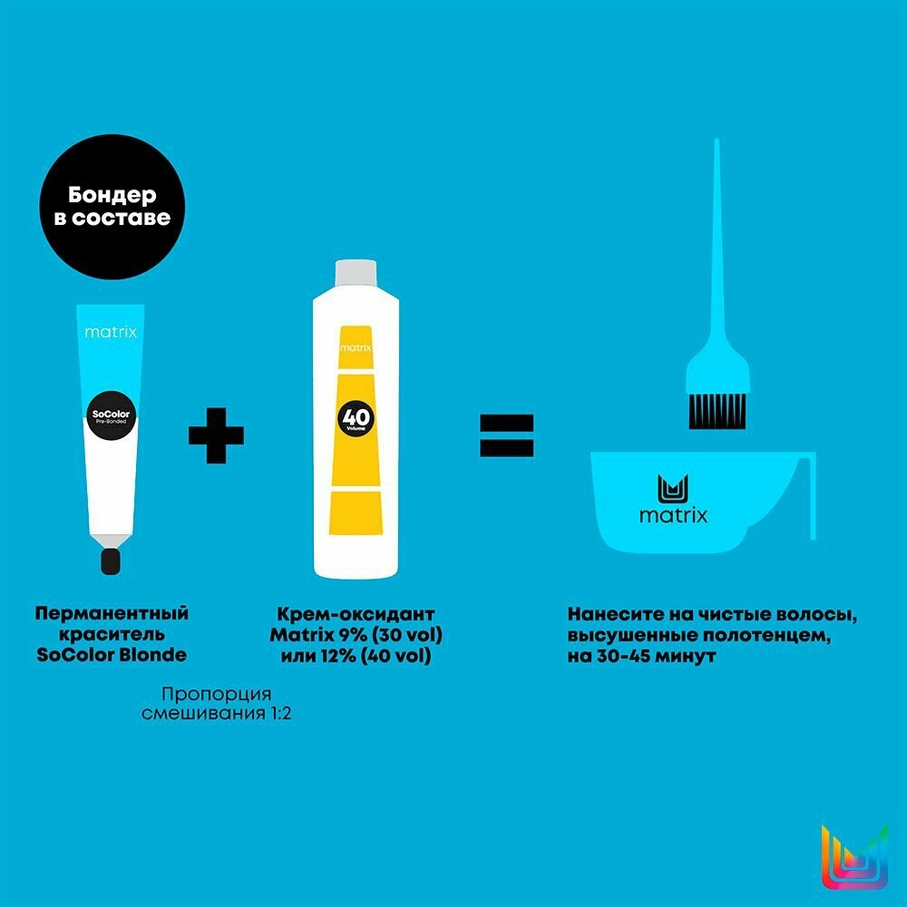 | Способ применения | Работайте в перчатках. Смешайте краситель с крем-оксидантом Matrix в пропорции 1 к 1 и нанесите смесь на волосы. Время выдержки зависит от базы и желаемого оттенка. Чтобы добиться стойкого и предсказуемого результата, производитель рекомендует использовать краситель только с оксидантами Matrix. |
