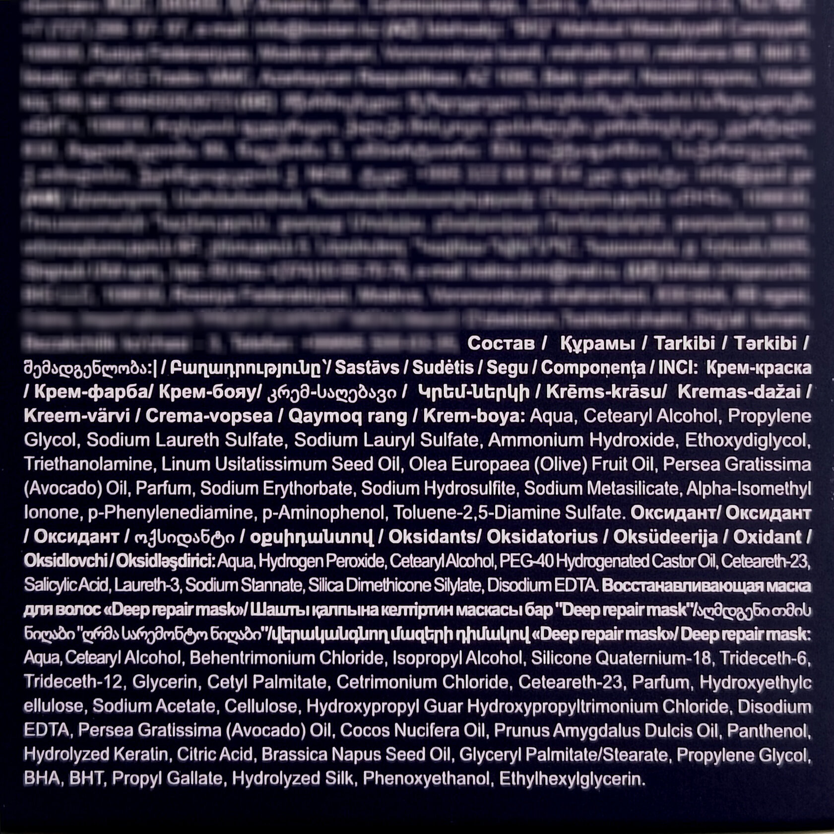 | Состав | Aqua, Cetearyl Alcohol, Propylene Glycol, Sodium Laureth Sulfate, Sodium Lauryl Sulfate, Ammonium Hydroxide, Ethoxydiglycol, Triethanolamine, Linum Usitassimum Seed Oil, Olea Europaea Fruit Oil, Persea Gratissima Avocado Oil, Parfum, Sodium Erythorbate, Sodium Hydrosulfite, Sodium Metasilicate, Alpha-Isomethyl lonone, p-Phenylenediamine, p-Aminophenol, 4-Chlororesorcinol. |