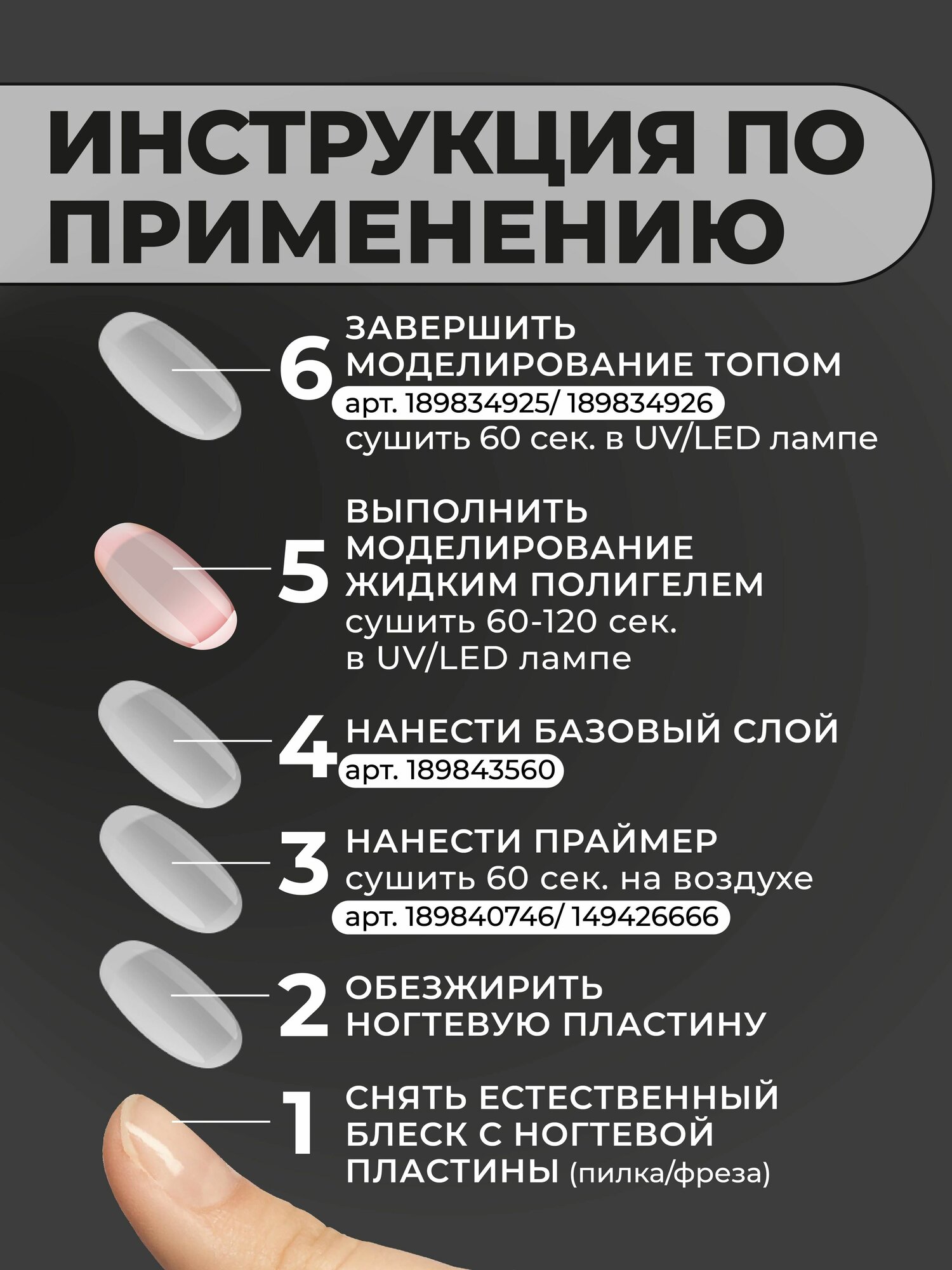 | Способ применения | Способ применения: нанести выравнивающим слоем, просушить в UV/LED лампе 60-120 секунд в зависимости от мощности и толщины слоя. *Рекомендуем для лучшей сцепки наносить жидкий акрилатик на подложку из прозрачной базы. |