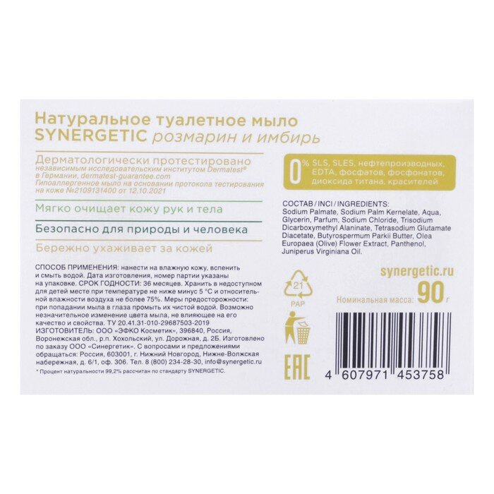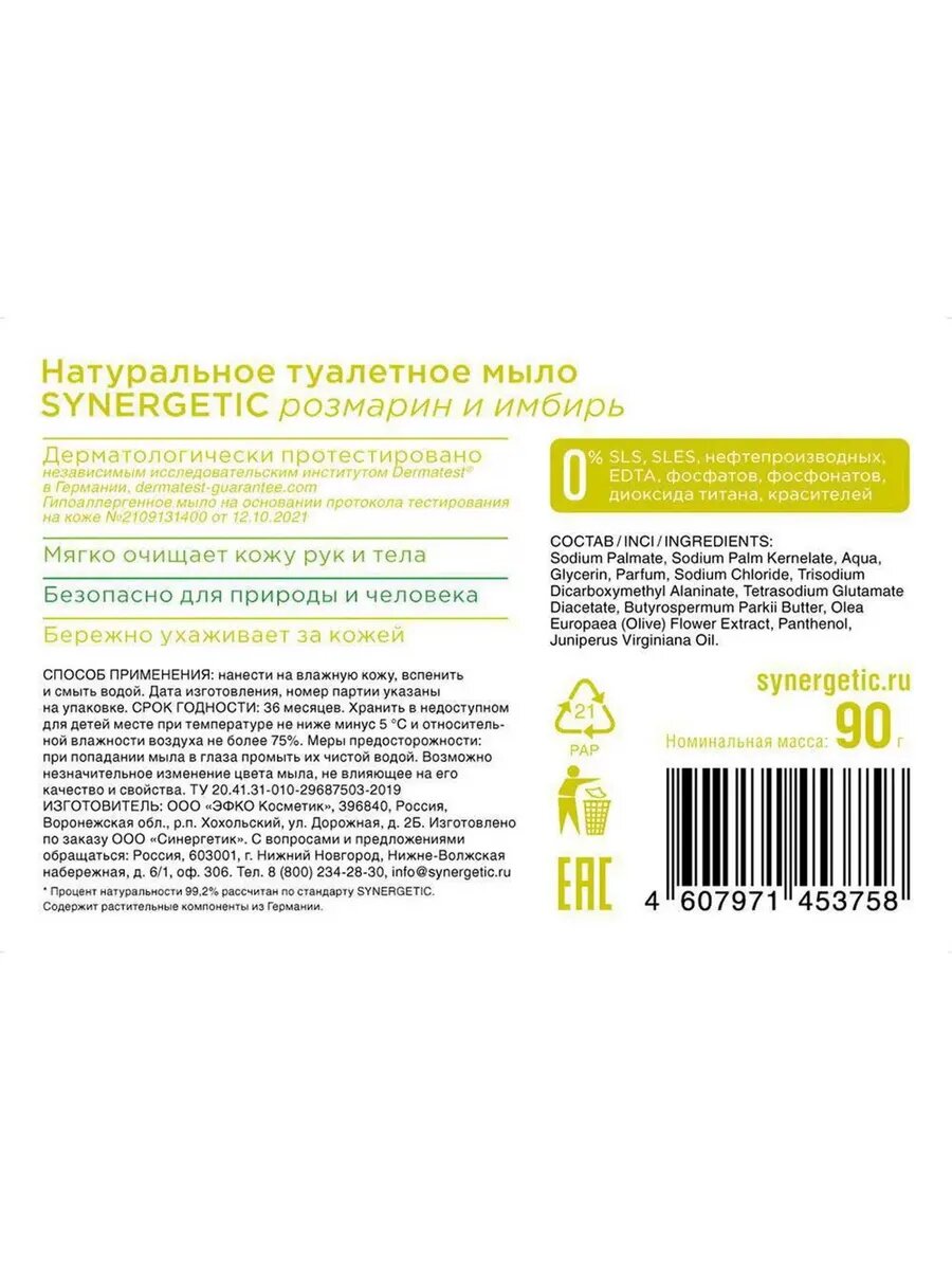 СохранитьМыло туалетное Synergetic натуральное, Розмарин и имбирь, 90 г (4607971453758) интересное: