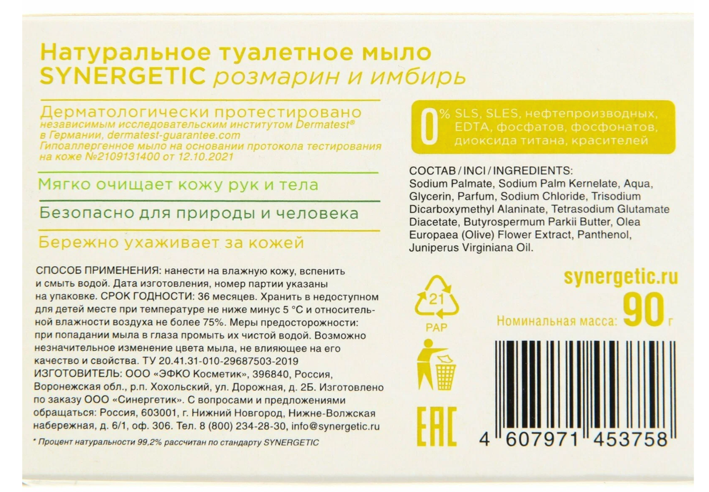 Купить Мыло туалетное Synergetic натуральное, Розмарин и имбирь, 90 г (4607971453758)