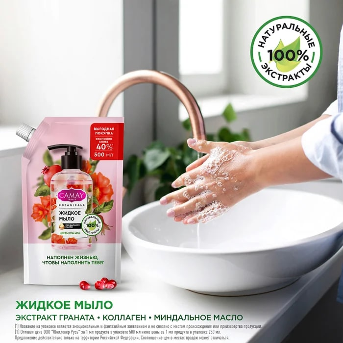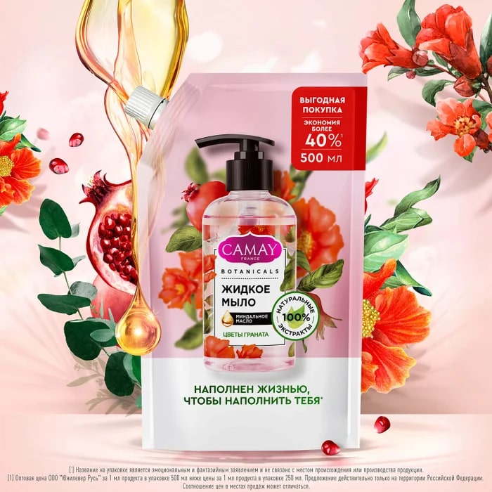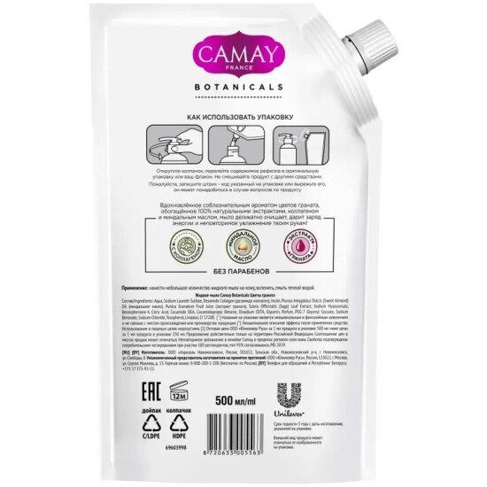CAMAY BOTANICALS цветы граната жидкое мыло с коллагеном миндальным маслом на 100% натуральной основе 500 мл