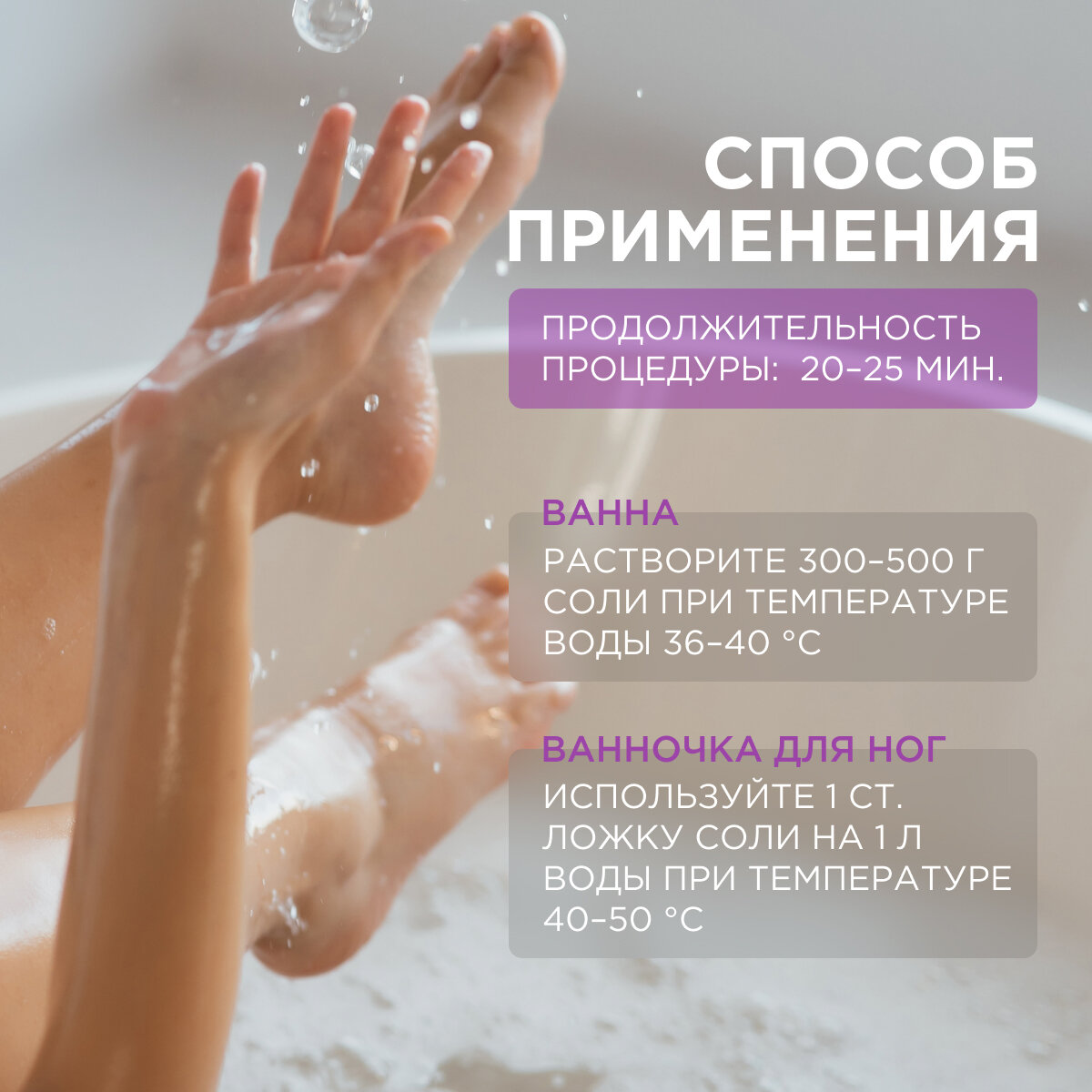 | Способ применения | для ванны - растворить 300-500 грамм соли во всем объеме ванны при температуре воды 36-40 градусов. Для ванночки для ног - растворить соль из расчета 1 ст. л. на литр воды при температуре 40-50 градусов. Продолжительность процедуры — 10-15 минут |