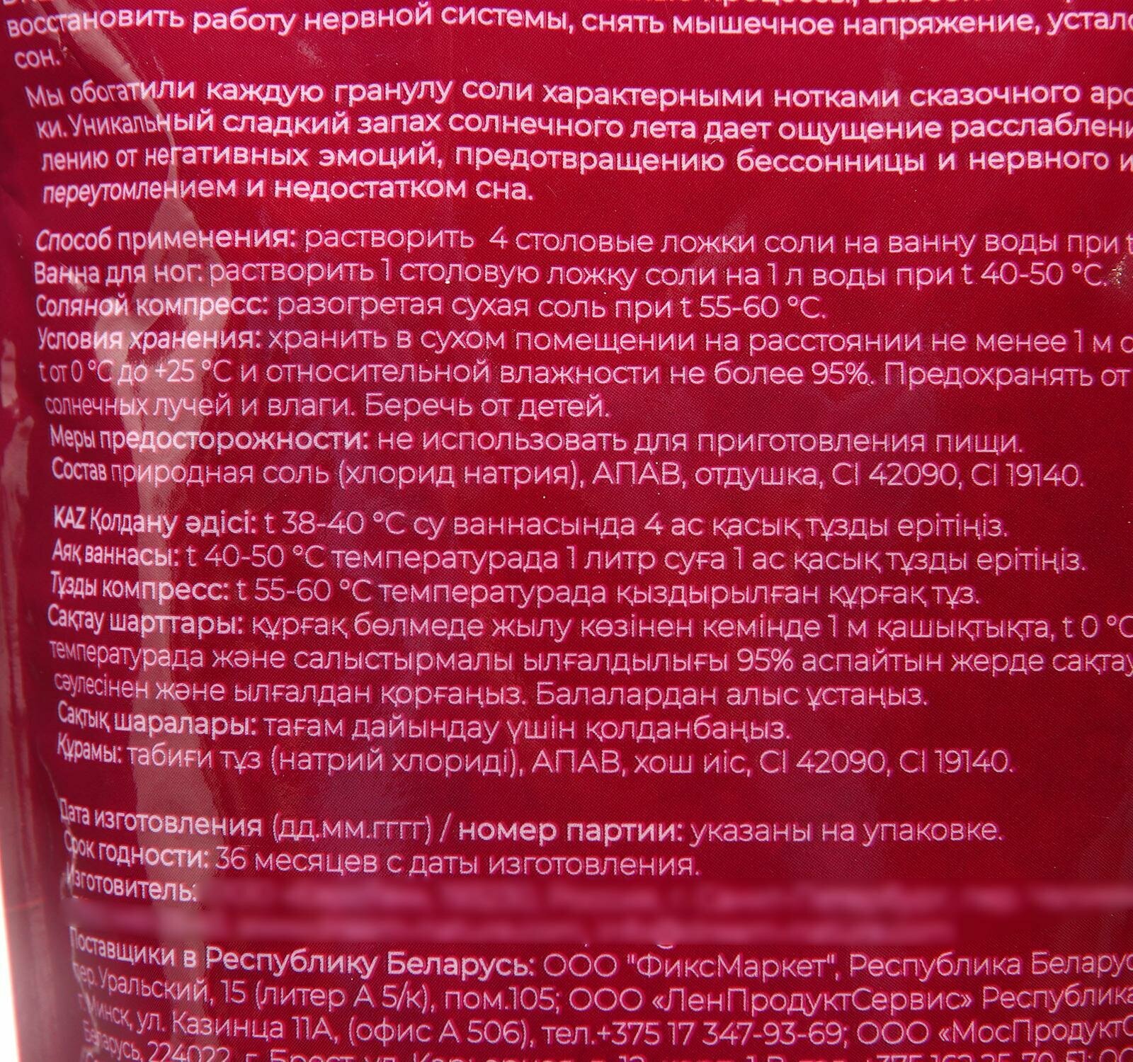 | Состав | природная соль (хлорид натрия), А-ПАВ, отдушка, CI 42090, CI 19140. |