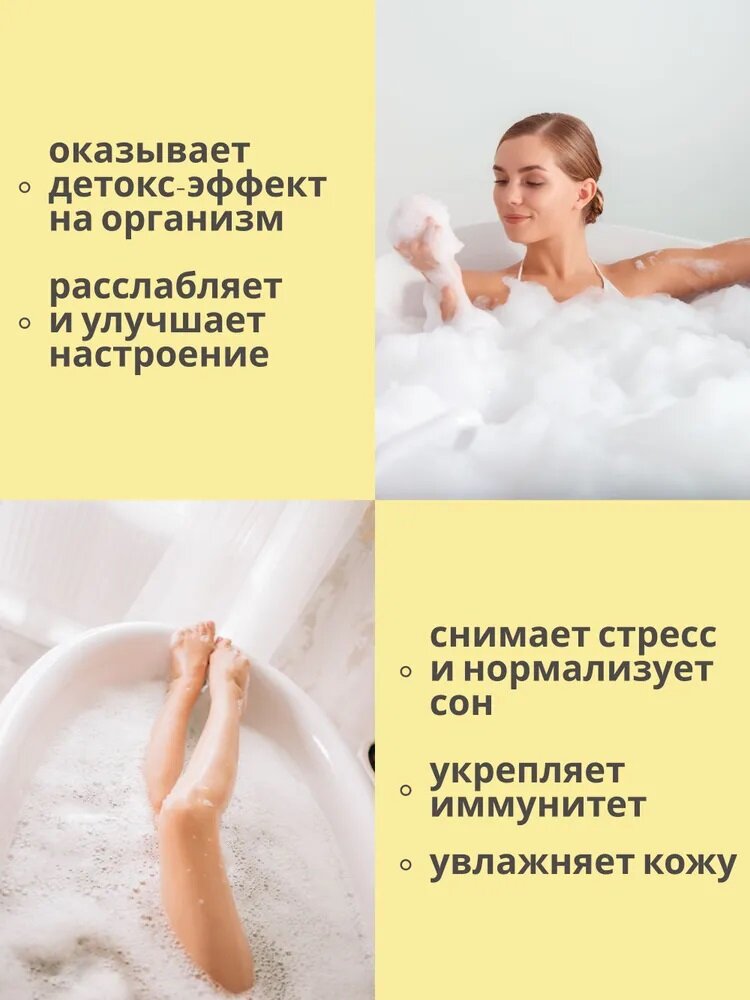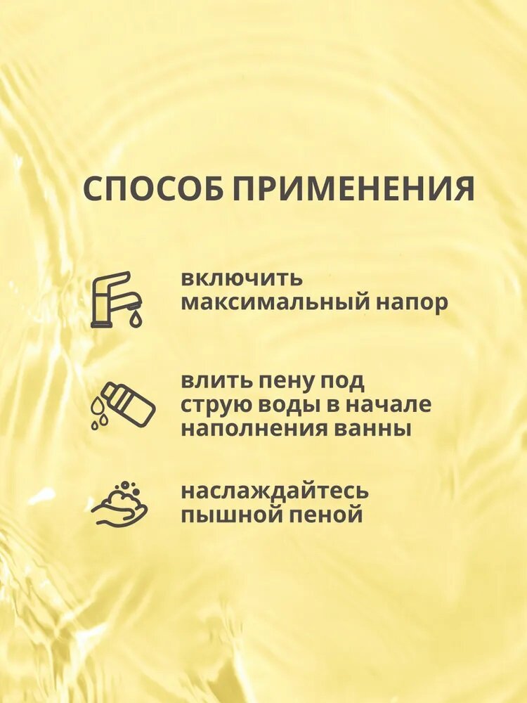 | Способ применения | При наполнении ванны влейте 100 мл средства под струю воды, через пару минут образуется густая пена. Рекомендуется использовать сильный напор и не выключать воду, пока пена не образовалась. Принимайте ванну в течение 20-30 минут. |