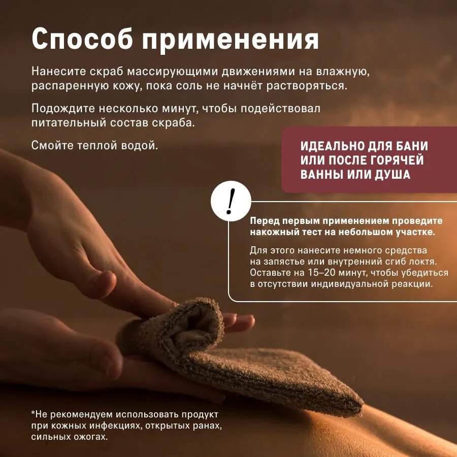 | Способ применения | Нанесите скраб на влажную кожу рук, ног и тела круговыми массирующими движениями. Включите воду в душе и продолжайте втирать скраб, пока он полностью не смоется. Если вы предпочитаете принимать ванну, нанесите скраб и оставьте на три минуты до того, как вы сядете в воду. Рекомендуем использовать 2-3 раза в неделю для эффективного результата. Храните закрытым при температуре от +5 до 25С. |