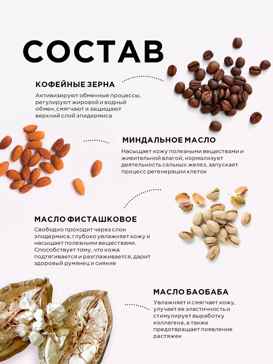 | Отшелушивающее вещество | кокос / кофе / сахар / соль |