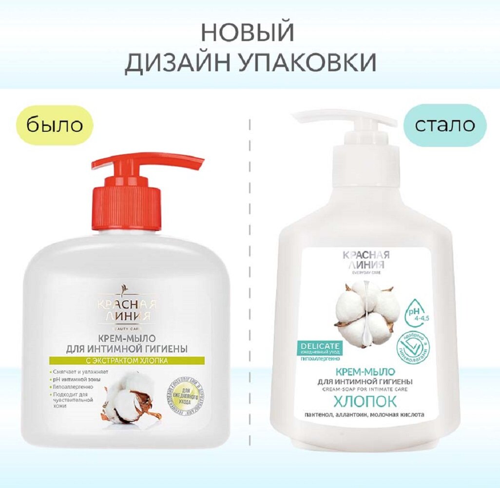 Увлажняющее крем-мыло для интимной гигиены красная линия с Экстрактом Хлопка против раздражения и сухости, 250 мл