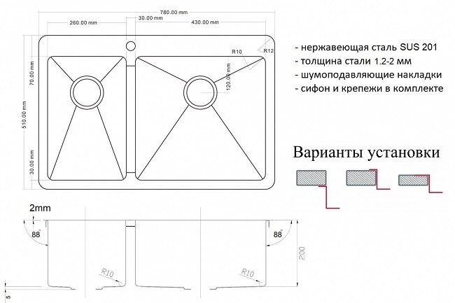 Мойка кухонная ZORG LIGHT ZL R 780-2-510-R ZORG Мойка кухонная ZORG LIGHT ZL R 780-2-510-R