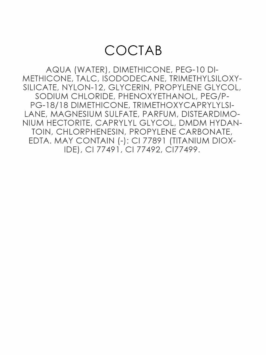 | Состав | aqua (water), dimethicone, peg-10 dimethicone, talc, isododecane, trimethylsiloxysilicate, nylon-12, glycerin, propyleneglycol, sodiumchloride, phenoxyethanol, peg/ppg-18/18 dimethicone, trimethoxycaprylylsilane, magnesiumsulfate, parfum, disteardimoniumhectorite, caprylylglycol, dmdmhydantoin, chlorphenesin, propylenecarbonate, edta. may contain (±): ci 77891 (titanium dioxide), ci 77491, ci 77492, ci77499 |
