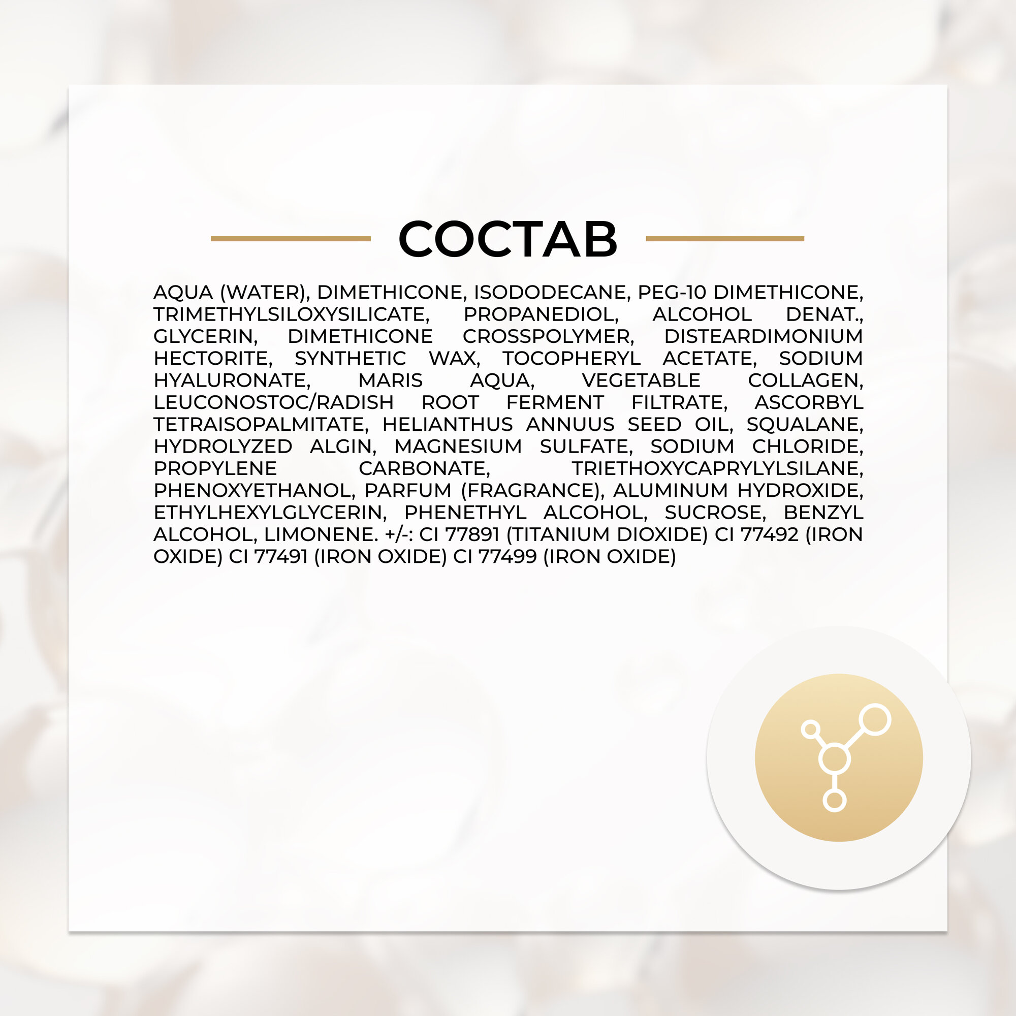 | Состав | aqua (water), dimethicone, isododecane, peg-10 dimethicone, trimethylsiloxysilicate, propanediol, alcohol denat., glycerin, dimethicone crosspolymer, disteardimonium hectorite, synthetic wax, tocopheryl acetate, sodium hyaluronate, maris aqua, vegetable collagen, leuconostoc/radish root ferment filtrate, ascorbyl tetraisopalmitate, helianthus annuus seed oil, squalane, hydrolyzed algin, magnesium sulfate, sodium chloride, propylene carbonate, triethoxycaprylylsilane, phenoxyethanol, parfum (fragrance), aluminum hydroxide, ethylhexylglycerin, phenethyl alcohol, sucrose, benzyl alcohol, limonene. +/-: ci 77891 (titanium dioxide), ci 77492 (iron oxide), ci 77491 (iron oxide), ci 77499 (iron oxide) |