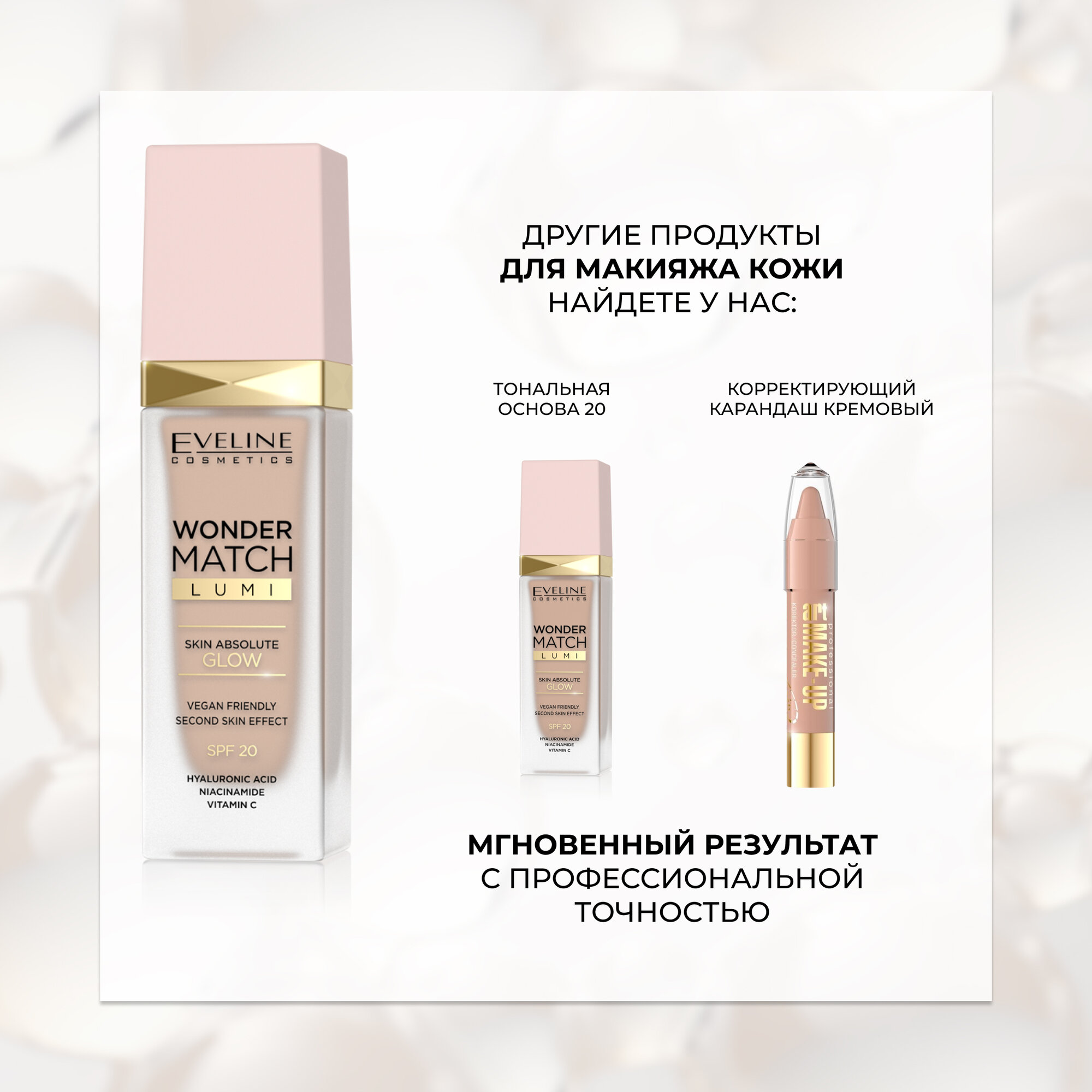 Эксклюзивная тональная основа EVELINE WONDER MATCH LUMI тон №20 30мл