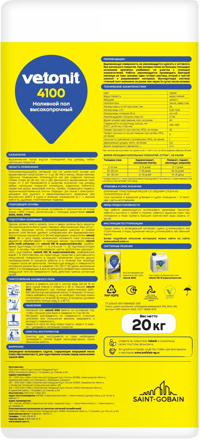 | Дополнительная информация | время высыхания в зависимости от толщины слоя и вида напольного покрытия составляет от 3 до 21 дня; цвет: серый; время начала схватывания: не ранее 45 мин; подвижность по расплыву кольца: 260-300 мм; деформация усадки: не более 0,5 мм/м; время нанесения след. слоя через 24 ч; фасовка: бумажный трехслойный мешок со средним слоем из полиэтилена |