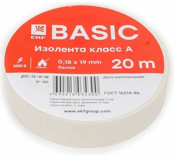 Изолента класс А 0.18х19мм (рул.20м) бел. EKF plc-iz-a-w
