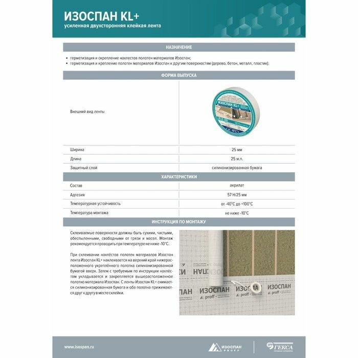 | Дополнительная информация | адгезия: 57Н/25мм; монтаж рекомендуется проводить при температуре не ниже −10 °С |