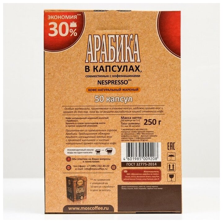 Кофе в капсулах 50 порций для Nespresso, московская кофейня на паяхъ "Арабика", арабика 100%