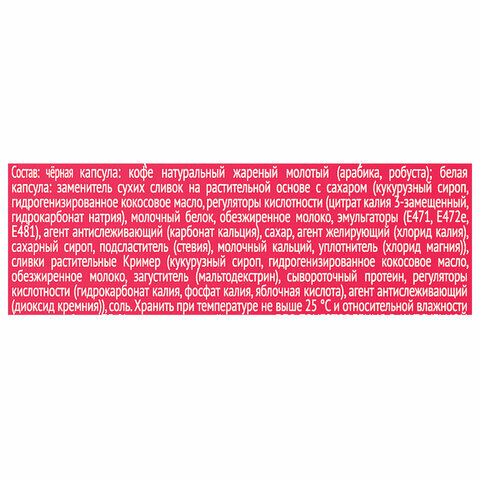 | Состав | заменитель сливок на растительной основе (кукурузный сироп, гидрогенизированное кокосовое масло, регуляторы кислотности (цитрат калия 3-замещенный, гидрокарбонат натрия), молочный белок, обезжиренное молоко, эмульгаторы (E471, E472e, E481), агент антислеживающий (карбонат кальция), сахар, агент желирующий (хлорид калия), сахарный сироп, подсластитель (стевия), молочный кальций, уплотнитель (хлорид магния)), кофе натуральный растворимый |