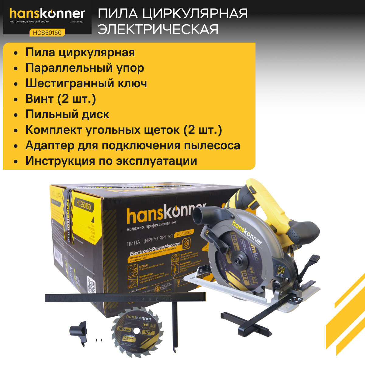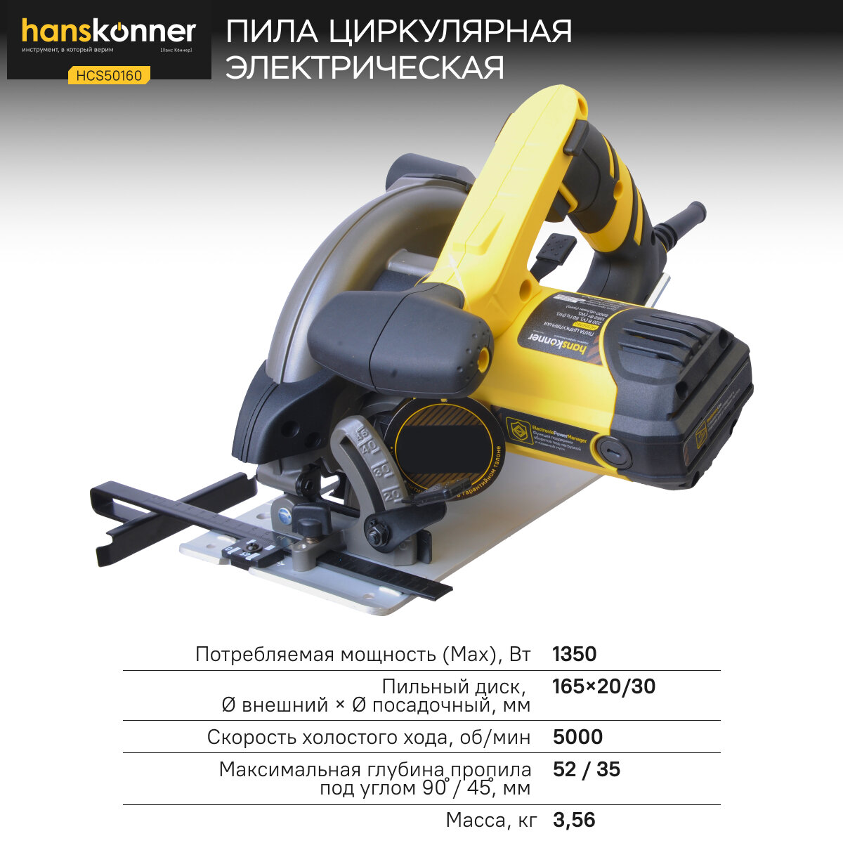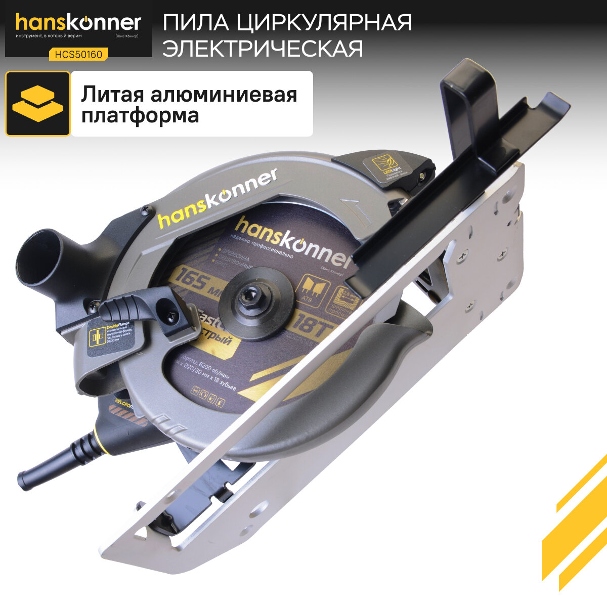 Пила циркулярная Hanskonner HCS50160, 1350Вт, ТПД, 165х20мм, пропил 52мм, конст. эл-ка LED