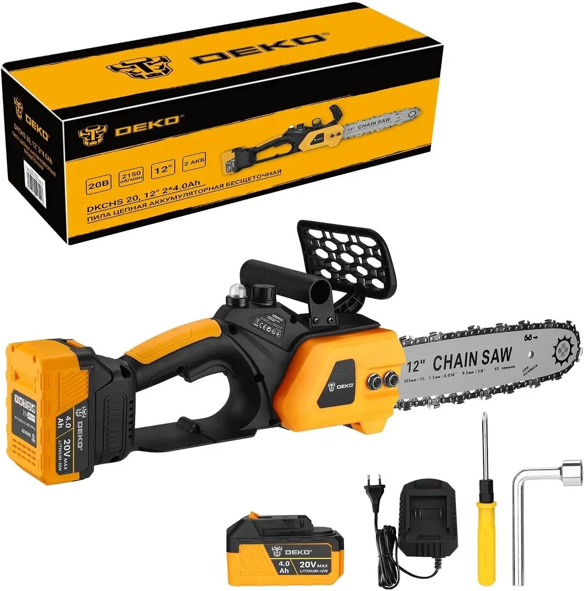 Бесщеточная аккумуляторная цепная пила Deko DKCHS 20, 12", 20В, 2x4.0Ач, з/у