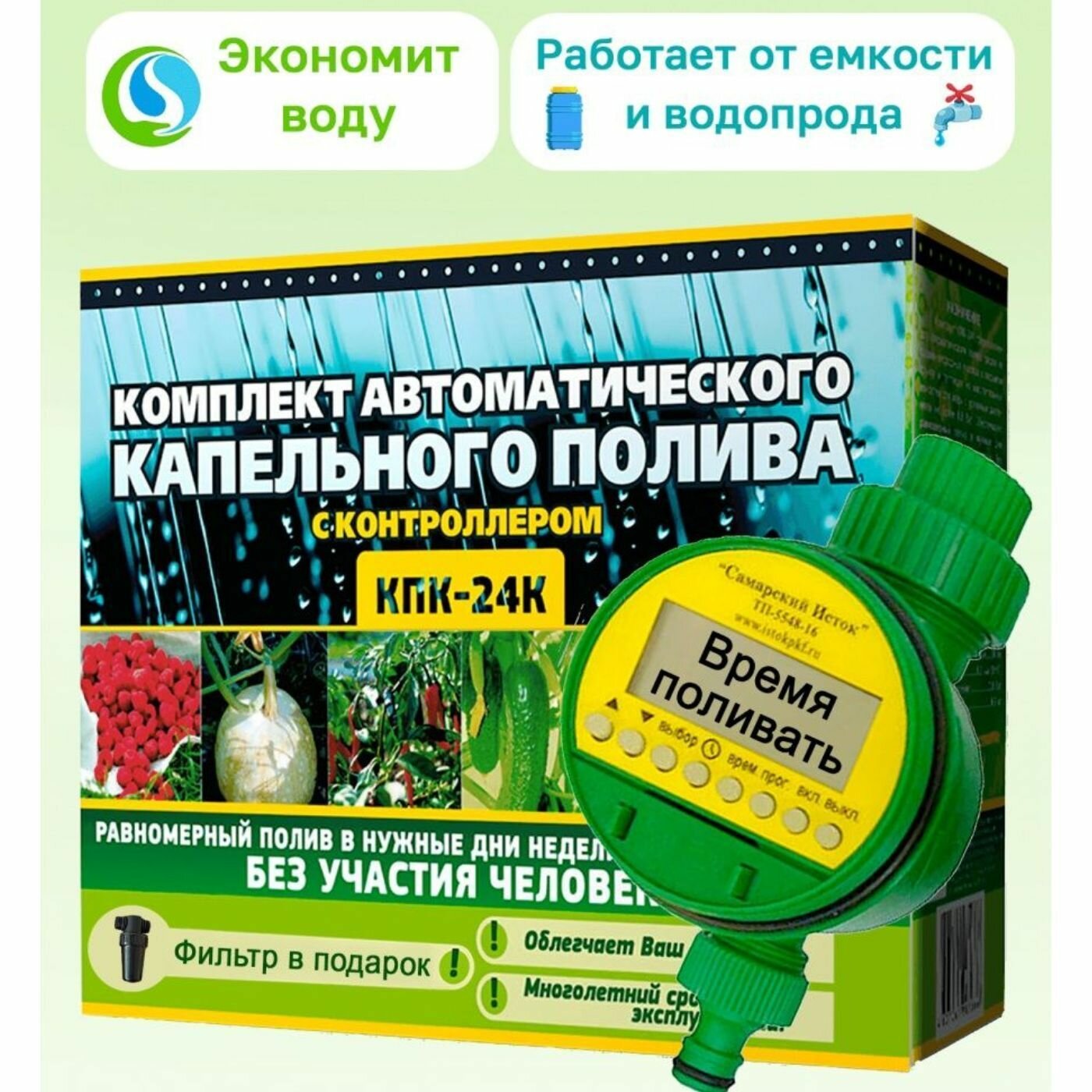 | Дополнительная информация | Набор капельного автоматического полива на 80 растений с таймером в теплице, парнике и на открытой грядке КПК 24 К Исток для дачи, сада или огорода и подробная инструкция по эксплуатации. Внимание. сейчас в России продаётся очень много китайских наборов полива низкого качества под брендом Исток. Будьте осторожнее к предложениям купить такой набор капельного полива по "супер низким ценам"! Вы приобретаете фирменный готовый комплект автополива под ключ от прямого представителя завода-изготовителя товара-фирмы Исток. |