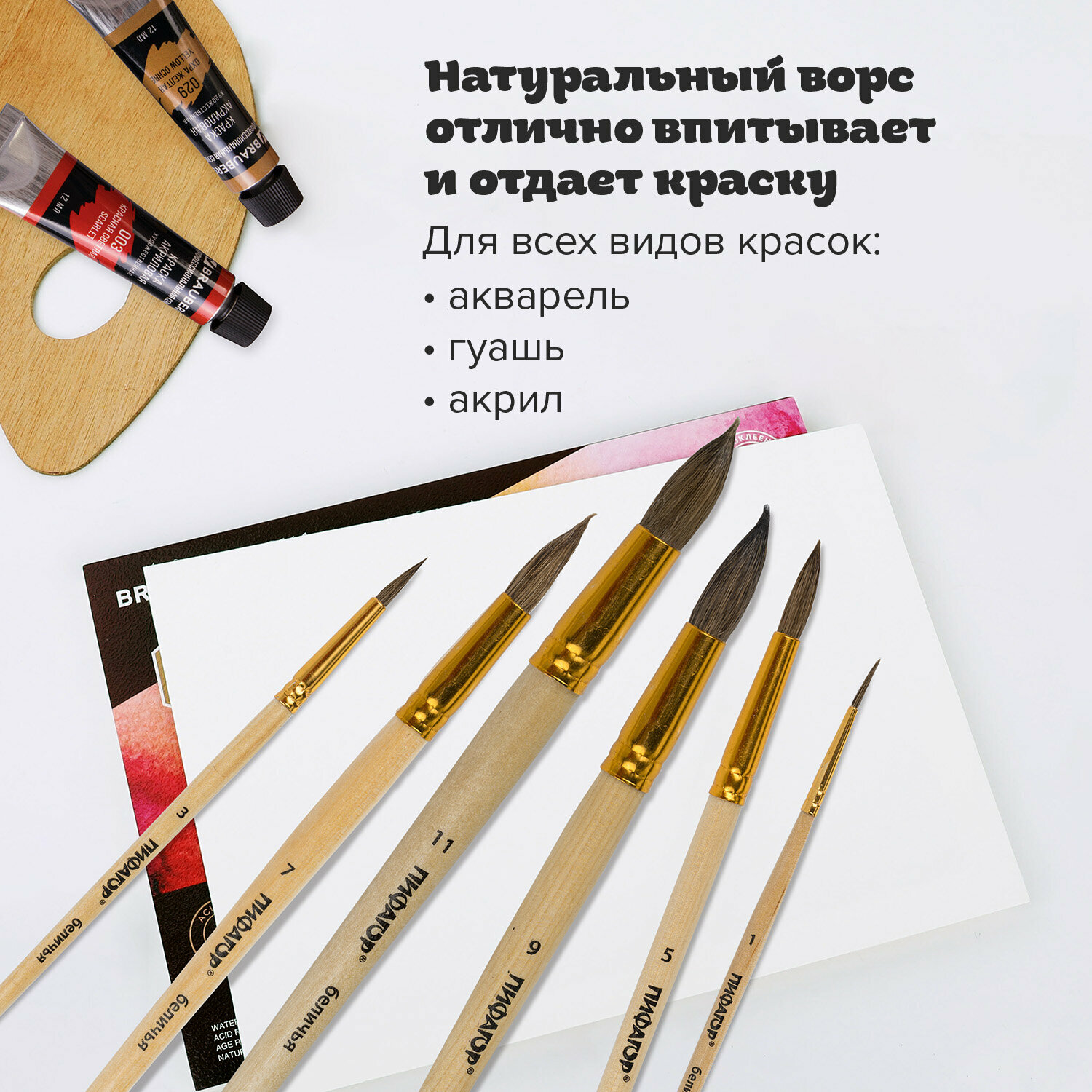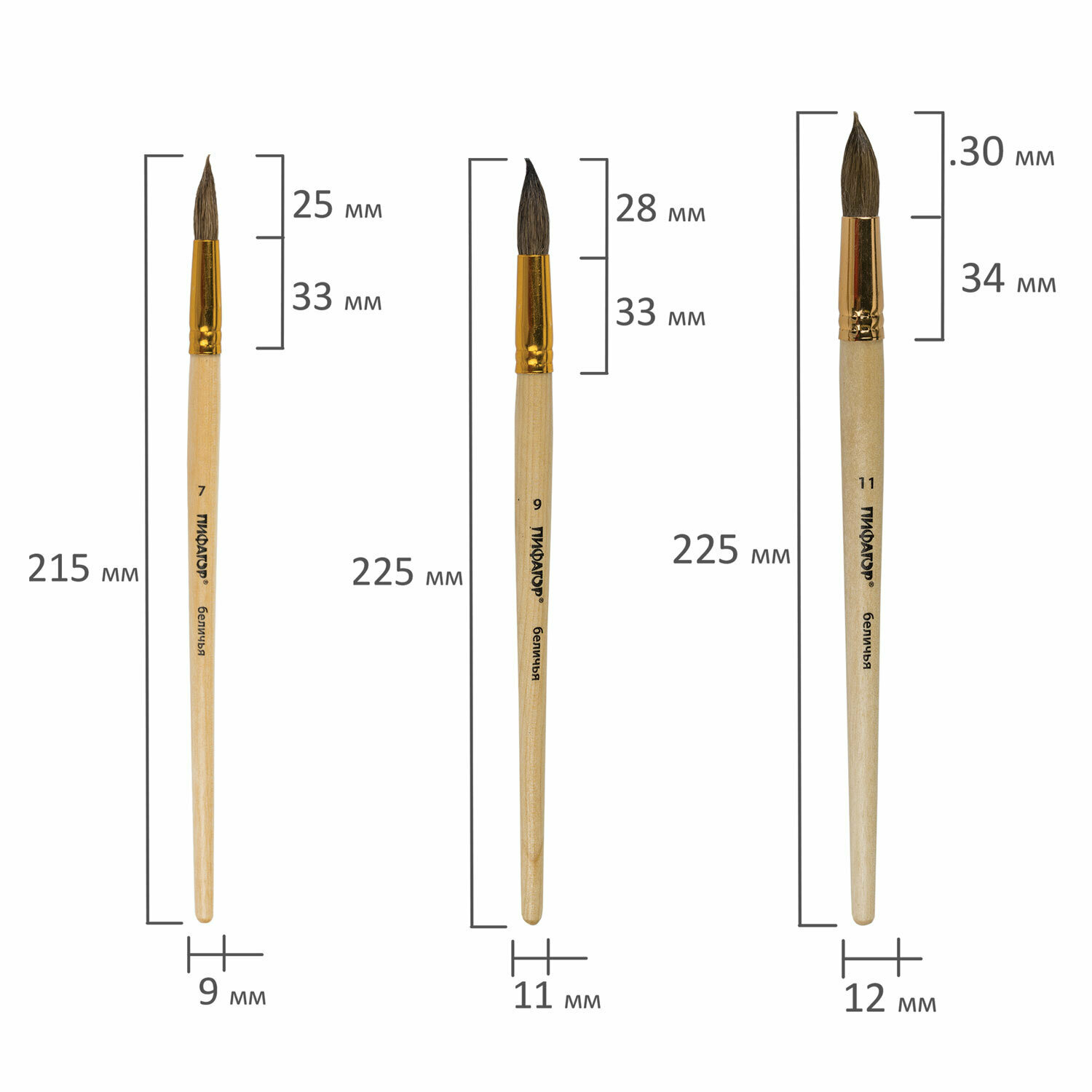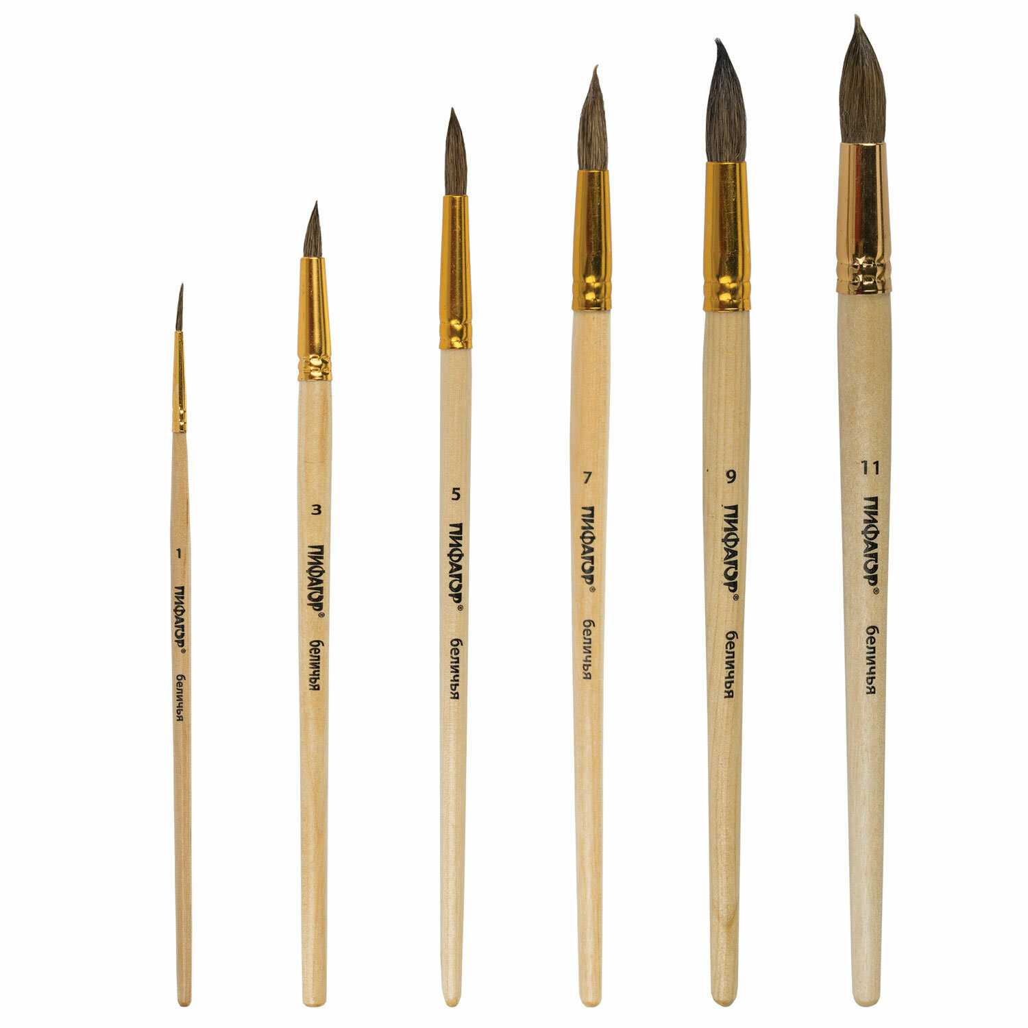 Кисти пифагор, набор 6 шт. (беличьи, круглые № 1, 3, 5, 7, 9, 11), блистер, 200891