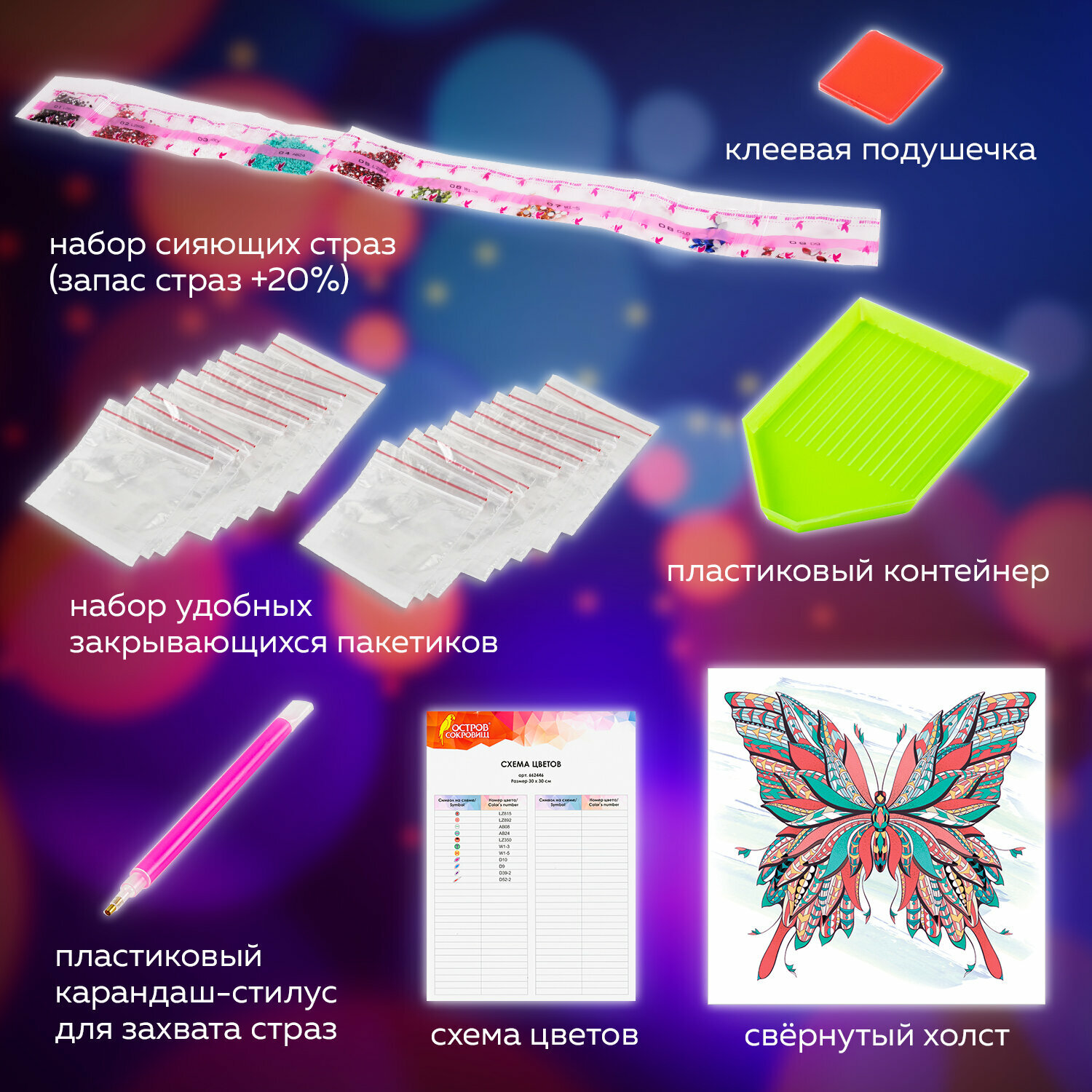 | Особенности | лоток для страз / пинцет / подрамник / с цифрами / стилус / холст / цветная схема / ювелирная огранка |