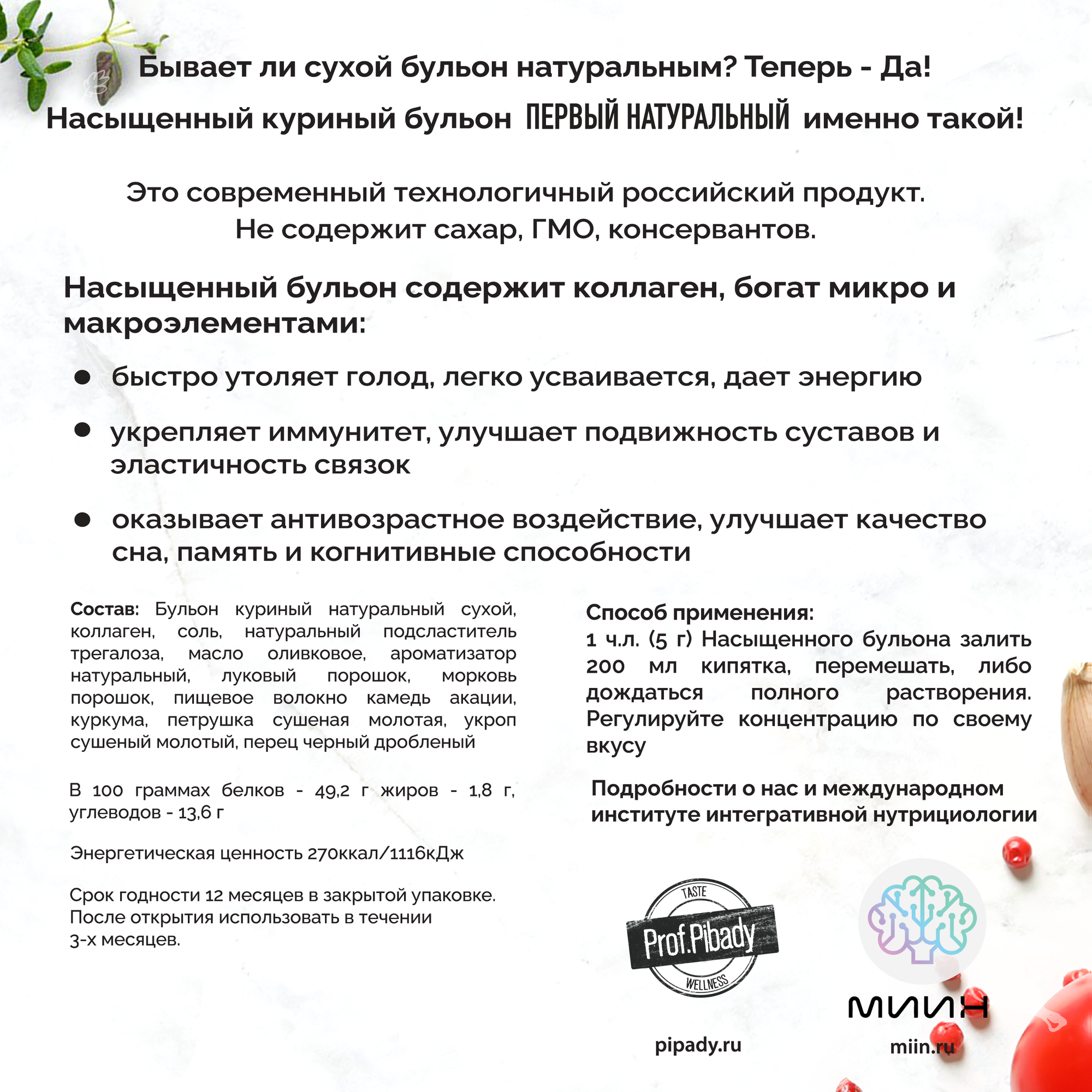 | Состав | Состав: Бульон куриный натуральный сухой, коллаген, соль, натуральный подсластитель трегалоза, масло оливковое, ароматизатор натуральный,морковь порошок, пищевое волокно камедь акации, куркума, петрушка сушеная молотая, укроп сушеный молотый, перец черный дробленый. |