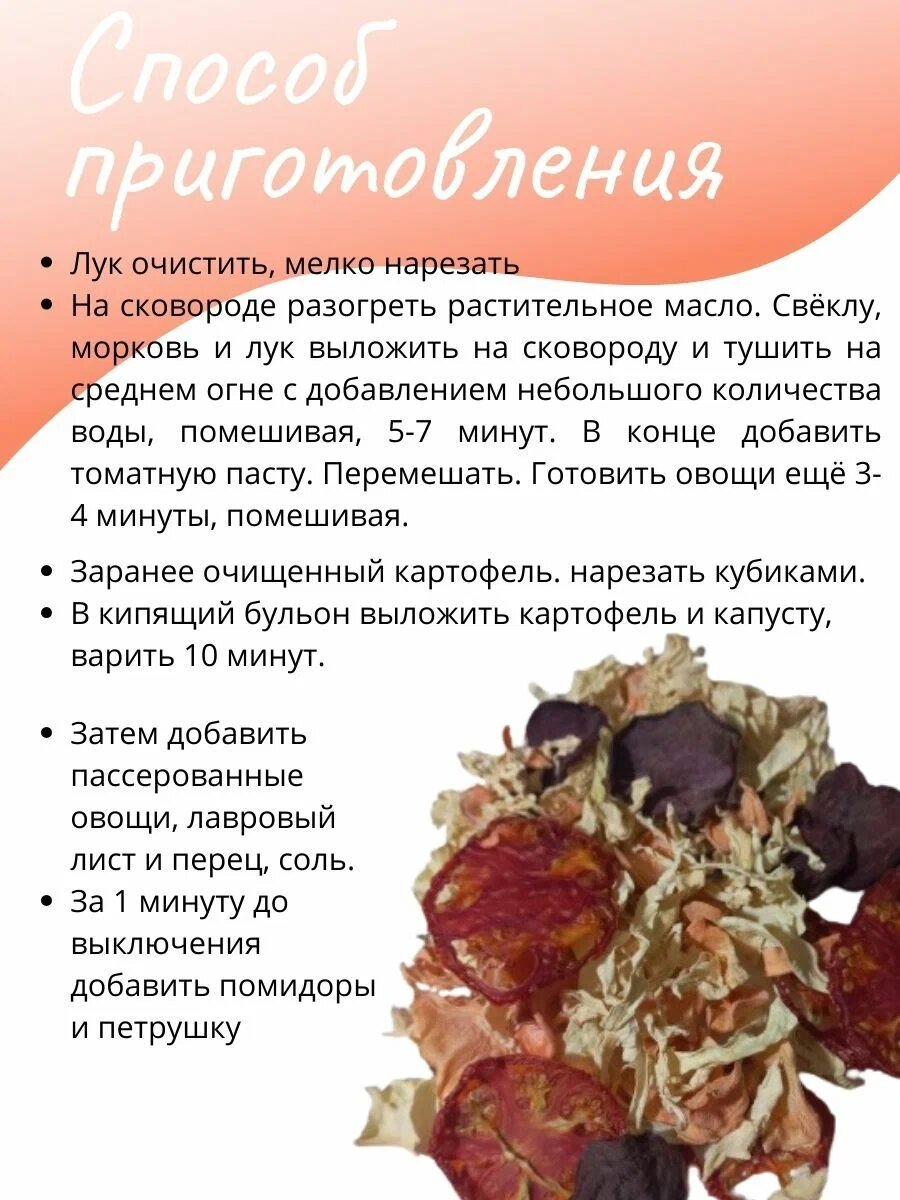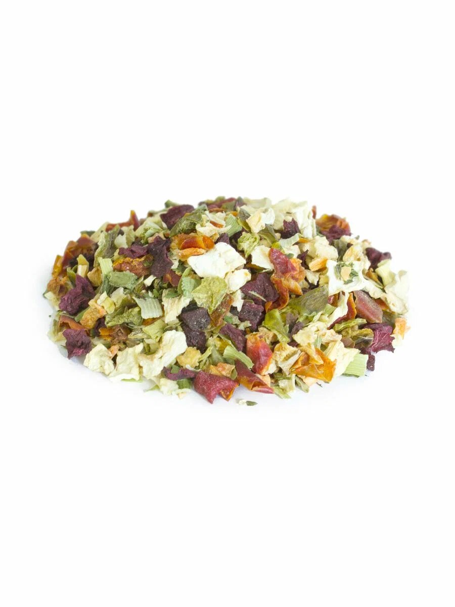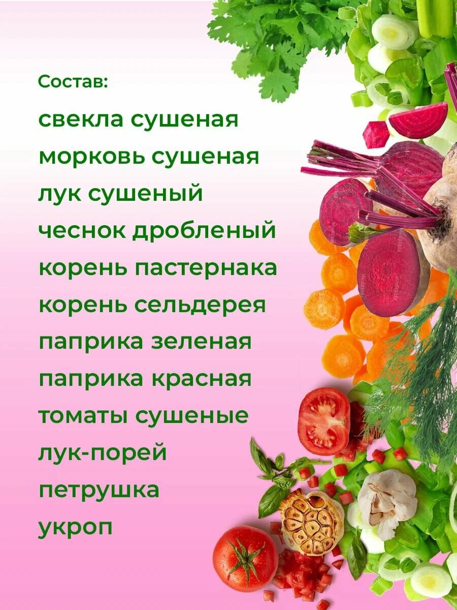 | Состав | свекла сушеная, морковь сушеная, лук сушеный, чеснок дробленый, корень пастернака, корень сельдерея, паприка зеленая хлопьями, паприка красная хлопьями, томаты сушеные, лук-порей, петрушка, укроп.⭐️ |