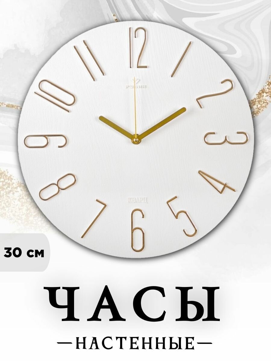 Часы настенные Рубин бесшумные, "Классика", корпус белый, золото, d-30см (3010-002) интересное: