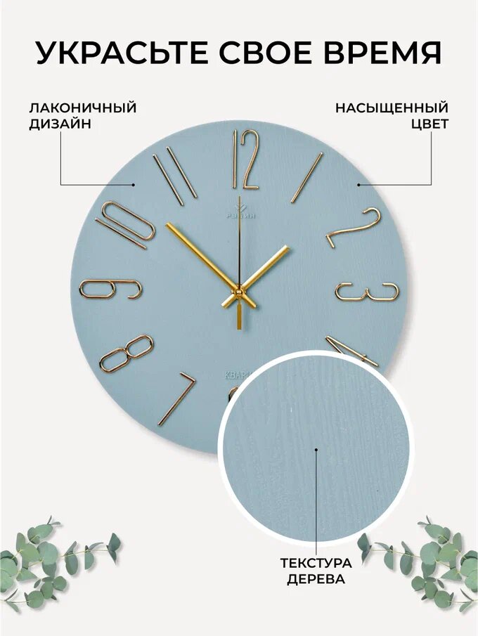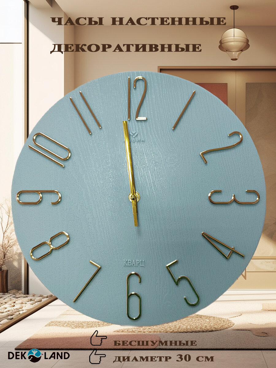 Бесшумные настенные круглые часы 30 см диаметр, кварцевые часы Рубин без стекла, Синий + Золото/ Интерьерные часы синие циферблат золото