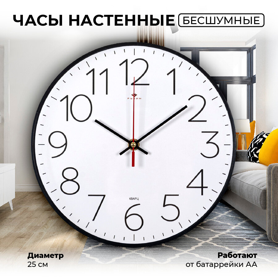 Купить Часы большие настенные кварцевые в форме круга в современном стиле Рубин Классика 25 см с большими арабским цифрами